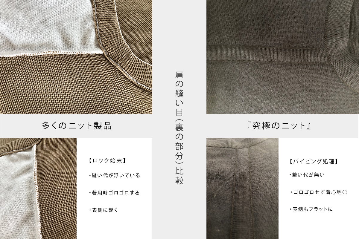 一般的なニットは下記画像左側のように、「ロック始末」と言って繋ぎわせたところがゴツゴツします。(下記画像:左)