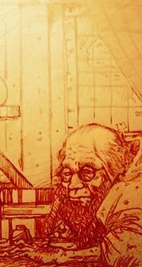 〔図版解説〕2014年発表。ヤングの代表作として知られる「たん○ぽ娘」、私が最高傑作と見る中篇「時が新しかったころ(When ○ime Was Young)」、訳文の違和感が気になった長編「時が新しかったころ(Eridah○)」を比較、ラヴクラフトと二本立てで紹介した。この頃はまだ絵も字も不安定、中村氏の翻訳よりはるかに違和感だらけの出来だ。模造紙に水彩絵の具という組み合わせもそうだけど、不慣れな大きさで描くのって傍で思うよりずっと大変なんよ。デジタルのように修正もできないし。