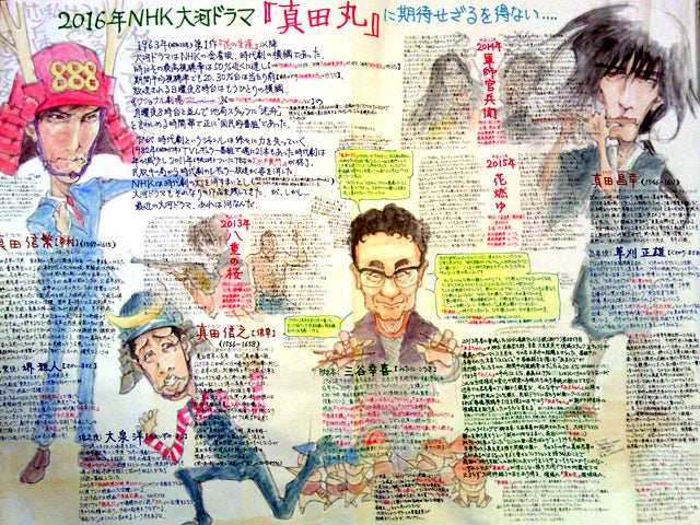〔図版解説〕2016年大河ドラマの話題。前年に妄想で描いたので見事に似てない。まさか全員和服だったとわー。2015年までいささか残念な作品が続いていたことを嘆いている。今の大河の低迷もこうした積み重ねの賜物である。三谷やくんくのせいではない。