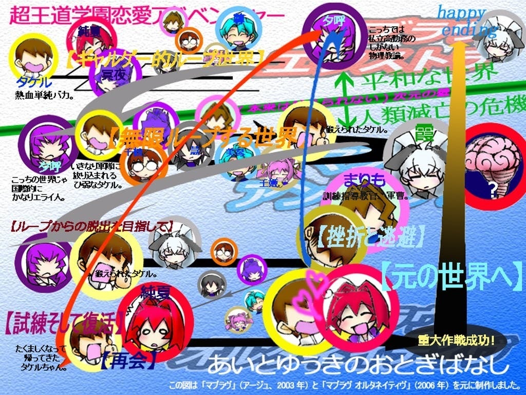人間、一生のうちにできることはそう多くはないでしょう。いつまで健康でいられるかなんて誰にもわかったもんじゃありません。ですから私も当面は「進○」「マ○ラヴ」両作品の周辺に限って解題に努めるつもりです。後日研究がある程度の完成を見た際にはこの複雑怪奇な引用の系統樹を公開、検証修正し枝葉を別の作品に繋げてくれる有志を募ろうかとも思っています。将来、Wikipe○iaに似たデータベースにまで成長したら…と妄想しないでもありません。そんな作業に果たしてどれほどの意義や価値があるのかは正直全くの未知数ですが、私の研究・発表とその継続にご賛同ご助力いただけるならこれ以上の幸いはありません。長文駄文(あと変な絵)、ここまでお読みいただき誠に有難うございました。