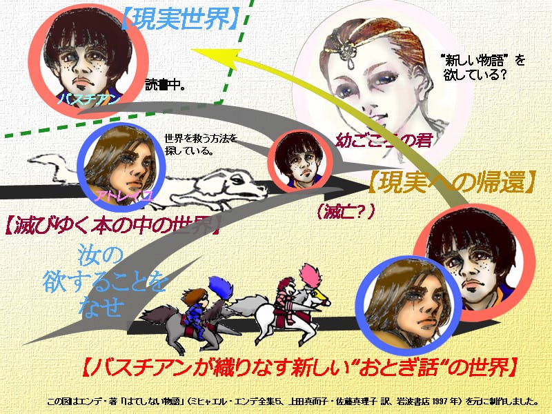 2019/12/07 15:00では「はてしない物語」(ミヒャエル・エンデ、1979)も検証してみよう。 この物語には「はてしない物語」という本を読んでいる少年・バスチアン、本の中で冒険している少年・アトレイユという二人の主人公が存在する。本の中の世界の女王“幼ごころの君”によるとこの世界は滅亡の危機に瀕しているのだという。世界を救う方法を探すため奔走するアトレイユ。手に汗握りその物語を読み続けるバスチアン。だが、真の救世主はこの本を読んでいる“あなた”なのだ!…さてどうするバスチアン!? 実は先に挙げた「うる星やつら2 ビューティフル・ドリーマー」はこの「はてしない物語」の翻案とみることができる。“幼ごころの君”によって本の中に引きずり込まれたバスチアンはその後好き勝手な冒険を繰り広げるのだが(*1)、その冒険活劇を鑑賞している“幼ごころの君”こそ「うる星2」でいう“ビューティフル・ドリーマー”なのだ。作中、“幼ごころの君”は現実世界でバスチアンが以前よく創作おとぎ話をしてやった近所の年下の少女であることが暗示されている(近頃はご無沙汰だったらしい)。その少女が現実世界で今どんな境遇にあるかはわからないが、バスチアンの“おとぎ話”を欲して彼を本の中に引き入れたのではないかと推測できる。「うる星」では普段つれない態度のあたるを眠れるラムがその夢の中に(愉快な仲間たちとともに)引き込んだのであり、「アンリミテッド」「オルタ」では「タケルちゃんに逢いたい!」という“眠り姫”純夏の悲痛な願いがタケルを「エクストラ」世界から引っ張ってきたのだ(*2)。「B・D」の上流にある「はてしない物語」も当然、多くの現代作品に影響を与えているといえよう。 前に挙げた作品の他にも「神秘の世界エルハザード」、(かなり変則的だが)「少女革命ウテナ」や「カードキャプターさくら」もまた「はてしない物語」の流れを受け継ぐ作品である。最近、ようやく新刊が出たという作り物めいた異世界を舞台にした「十二国記」シリーズもこの範疇ではないかと睨んでいるのだが、どうだろう(*3)。(*1)“幼ごころの君”はバスチアンを本の中に引きずり込んだ後、「汝の 欲することを なせ」という一文を残しどこかに消えてしまう。(*2)「B・D」における“幼ごころの君”はちょくちょく登場していた大きな帽子の幼女だろう。映画終盤にラム自身であることが明かされている。もし「エヴァ」で夢を見ているのがユイだとすれば“幼ごころの君”はレイ、『マブラヴ』で夢を見ている純夏に対する“幼ごころの君”は社霞(やしろ かすみ)…なのかもしれない。(*3)作中、「はてしない物語」を匂わせる会話文がある(延王・尚隆)。 もっと見る