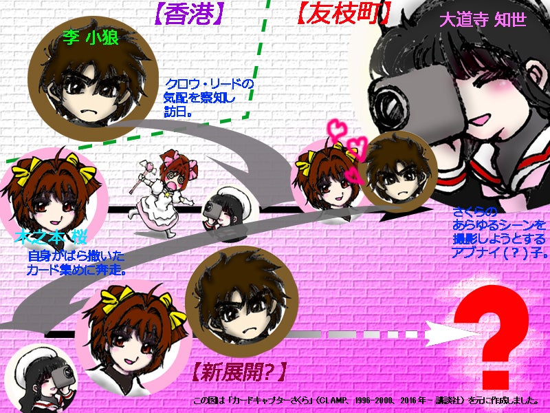 2019/12/07 15:00「カードキャプターさくら」(CLAMP、1996-2000,2016- )が「はてしない物語」の関連作品であるという状況証拠はあっても確証はない。なにせまだ完結してないし、「CCさくら」。 主人公・木之本桜(きのもと さくら)は、キャラクター論でいうとこれは「長くつ下のピッピ」(1945)に近い。活発で運動神経抜群、産まれてすぐ母を亡くしたため“母親が天使”でよくお空に語りかける…というあたりが重なる(但し、桜の場合語りかけるのは写真立てで、さらに母は比喩ではなくリアルの天使だ)。ピッピを(部分的でも)モチーフにしたキャラは珍しくなく、元々ピッピをアニメ化するつもりだったという「パンダコパンダ」(1972)、漫画「To-y」(1985-87)の山田二矢は父が外国船の船長、「ふしぎの海のナディア」(1990-91)ナディア姫はピッピの“根暗版”、「カウボーイビバップ」(1998)のエド(初登場時に警官二人と追いかけっこを繰り広げる)などと容易に挙げることができる。「マブラヴ」の鎧衣尊/鎧衣美琴はエドの流れを汲むからこれも… 話を「さくら」-「はてしない物語」に戻そう。早くに母を亡くした父子家庭という境遇と普段使われていない屋根裏部屋で“古い本”に似たカード入れを開くことで冒険物語が始まるという辺りが「はてしない物語」と重なるのだが、それ以上は解説が必要になるだろう。ここからは「さくら」=「はてしない物語」説が真であると仮定した上での推論。 桜は精霊を封じたカードを散逸させることで逃げたカードたちを集めるという任務を負う。企んだのは古の大魔導師クロウ・リード(故人)で、その魂の生まれ変わりが桜の父・藤隆、記憶と魔力を受け継いだのが柊沢エリオルである。桜が四苦八苦してカード集めをするうちにカードの魔力を感知し、香港から来日した李小狼はクロウの血を受け継いだ一族の末裔。当初、小狼はカード集めを競うライバルだったがカードは全て桜の元に集まり、最終的に桜と小龍は恋仲になる。2000年までの旧編では最後にエリオルが一連の騒動を総括し、桜が世界一の力を持つ魔術師になったと告げている。 普通、ファンタジーでは魔王を倒す等大きな目的があって、その手段として世界一の魔術を身に付けたりするものである。桜が危険を犯す動機は散逸させた自身の失態への負い目、「街が大変なことに」「カードさんがかわいそう」という小学生の女の子が命を賭けるには釣り合いそうに無い感情から来るものであって、世界一の魔術師になること自体を目的としてはいない。この物語の大きな目的とは何だろう。 「はてしない物語」で本の中の主人公・アトレイユは女王“幼ごころの君”から世界を救う方法を探せとの指令を受け命懸けの冒険を繰り広げた後、当の女王から実は任務の結果に大した意義はないという怒髪天モノの告白を受ける。命懸けの冒険をさせることで読んでいるほうの主人公・バスチアンを夢中にさせ本の中に引きずり込むことが狙いなのだという。「CCさくら」に当てはめると、桜のカード集め(及び書換え)自体には大した意義は無く、李小狼を来日させることが狙い…ということになろうか。ではこれを画策(CLAMP以外で)した「CCさくら」の“幼ごころの君”は誰か。エリオルは二人が結ばれることまでは予測できなかったと発言しているので、クロウ・リードではない。“おとぎ話”を欲した“幼ごころの君”はほぼ毎回桜の出撃に同行、危険を顧みず現場で目撃しビデオに収め続けた桜の親友・大道寺知世に他ならない。この世界は知世にとって極めて都合のいい世界だ。超優等生・知世が通う学校はかなり自由な校風で担任は優しくクラスにいじめも無し、授業もしょっちゅう遠足なり社会科見学なりで楽しい場所へ出かけている。自宅は大豪邸、母が常に仕事で多忙(*1)なため夜間の外出も自由(ボディーガードのエスコート付き)、無二の親友・桜とは一切いさかいも喧嘩も無く、しかも世界の危機を救っちゃうスーパーヒロイン(着せ替えもさせてくれるし)。これが知世の望んだ夢でなくて一体誰の夢なのか。知世こそが「CCさくら」世界の“ビューティフル・ドリーマー”なのである。 大道寺知世の外見は、平井和正「地球樹の女神」(1988-92)にある挿絵の後藤由紀子(山田章弘・画)に似ている。作中、平井自身が後藤にインタビューする(!)という章がありそこには「後藤由紀子さん、あなたはわたしのビューティフル・ドリーマーそのものなんです」と書かれている(徳間書店版、第3巻)(*2)。「地球樹の女神」のみならず、平井作品には世界を救う類の物語が見られる。「CCさくら」では桜と小狼が結ばれることでクロウ・リードの魂を持つ父・藤隆と天使である母・撫子の娘である桜と、クロウ・リードのDNAの後継者・小狼との間に子ができれば真のクロウ・リードの生まれ変わりあるいはクロウを越える何かになる可能性がある。これこそがこの物語の真の目的ではないだろうか。例えば将来、CLAMPワールド全体を揺るがす