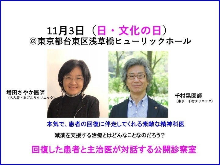 お二人とも患者さんの服薬している向精神薬を丁寧に減薬し、患者さんを回復に導いていることで知られています。全国から減薬したい患者さんが、噂を聞いて問い合わせをしてくるこの二人の医師と、実際にこの医師の元で回復した患者さんの『公開診察室』は、夢の対談といってもよいでしょう。