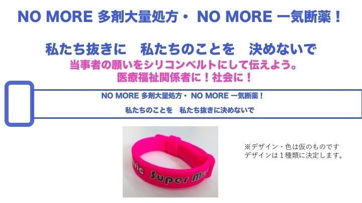私たちは今回、多剤多量処方に反対するメッセージをいれたリストベルトも作することにしました。