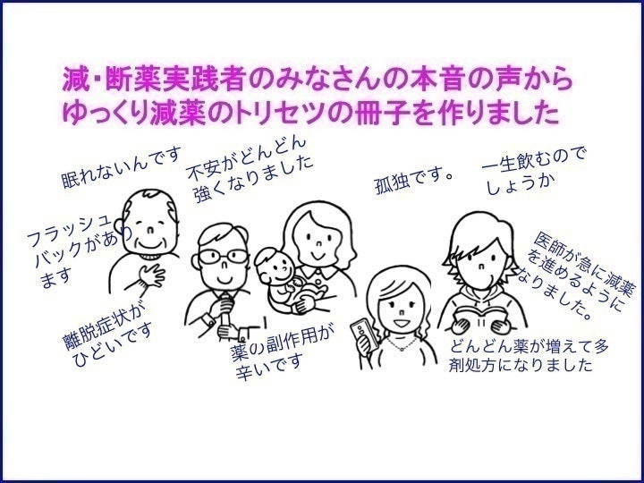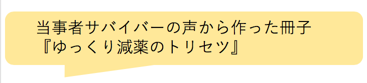 こんなことから、私たちはこの段階で一度、現在までにわかった当事者のみなさんのお話を整理して、疑問を持つ皆さんに向けて情報を発信してみようと思いたったのです。それが『ゆっくり減薬』のトリセツです。