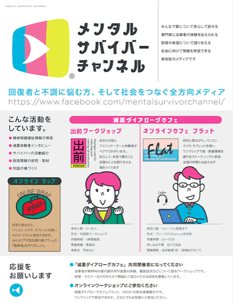 メンタルサバイバーチャンネルでは、浅草での定期的な『お薬当事者研究』のほかに毎週月曜日にインターネット上にオンラインの自助グループ『減薬ダイアローグカフェ』、火曜日には『薬のことを話す女子会』『トラウマを考える女子会』不定期企画として『オンラインメンタルヘルス講座』『オンラインWRAP』などを主催。この活動によって、回復やお薬のことで悩むメンタルヘルスユーザーの情報交換と交流の場を作ってきました。