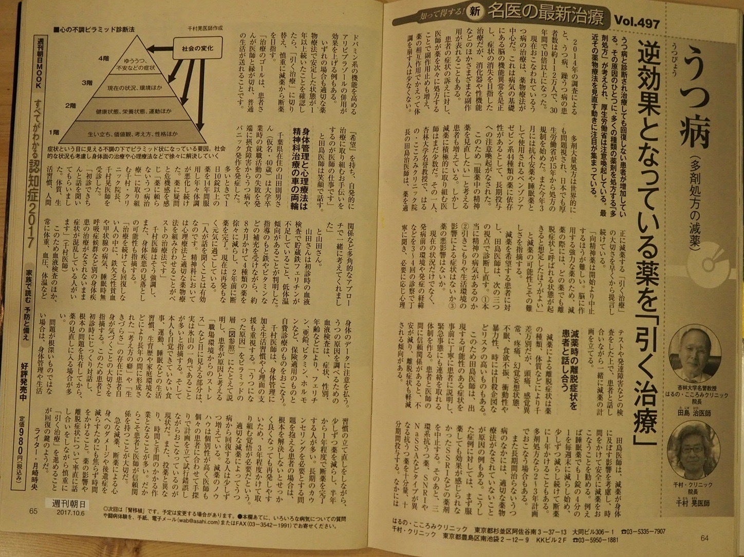 週刊朝日2017年10月6日号『名医の最新治療』うつ病(多剤処方の減薬)逆効果となっている薬を「引く治療」「朝日新聞出版に無断で転載することを禁じる」承諾番号「19-3603」
