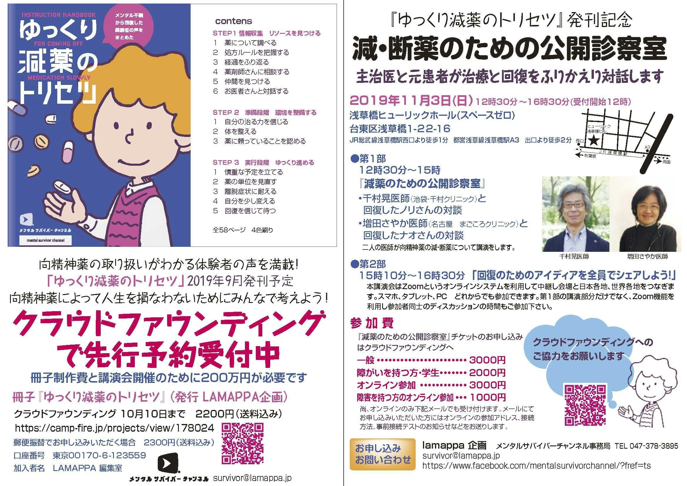 冊子『ゆっくり減薬のトリセツ』と講演会『減薬のための公開診察室』のチラシが出来ました。