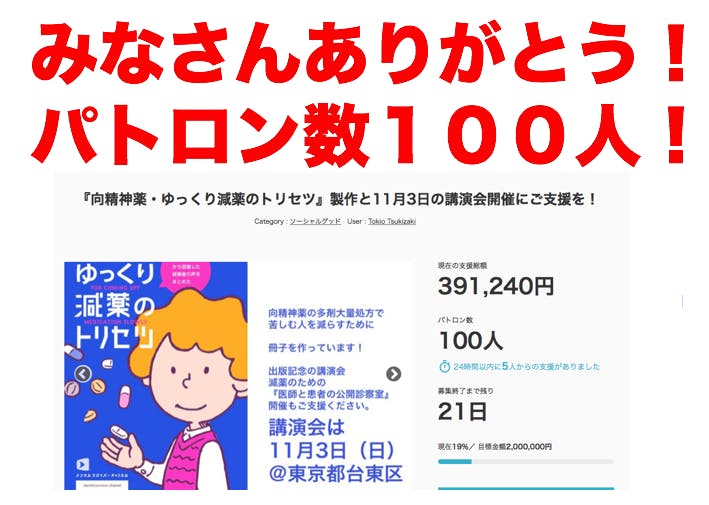 みなさんに、FBでたすけて〜とお願し、たくさんシェアしていただきました。そのおかげで、パトロン(支援してくださる方)がついに100人に!一人ひとりからいただいた思いを大切に頑張っていきます!ひきつづきよろしくおねがいしま〜す。