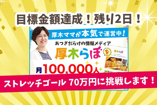 2019/08/25 11:52こんにちは!厚木らぼ田原礼美です。8月23日、ストレッチゴールである70万円も達成して45日間のクラウドファンディングを終了致しました。皆様のご協力・厚木への想いをいただき達成することができました。本当にありがとうございます!CAMPFIREのシステム上、今までどのご支援がどの方なのか分からないままでしたが、クラウドファンディングが終わってやっと個人情報が閲覧できるようになり、直接お礼のメッセージを送れるようになりましたので、お礼のメッセージと、リターンのご案内を今週から順次開始させていただきます。引き続き、どうぞ宜しくお願い致します!厚木らぼ 田原礼美 もっと見る