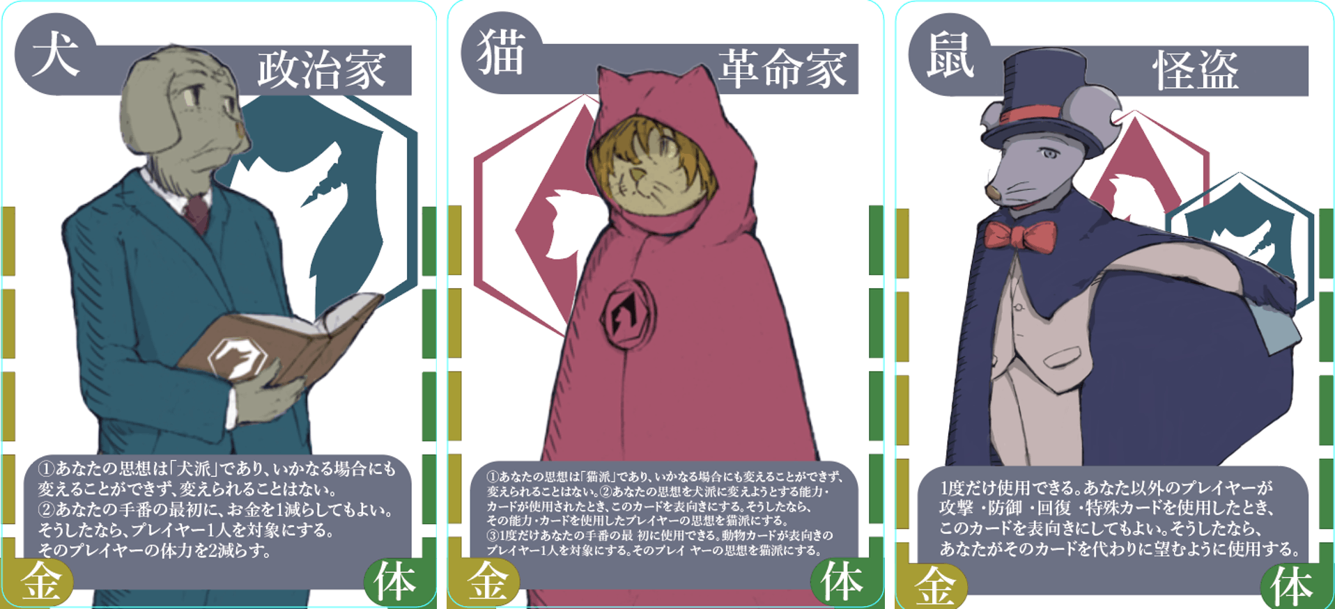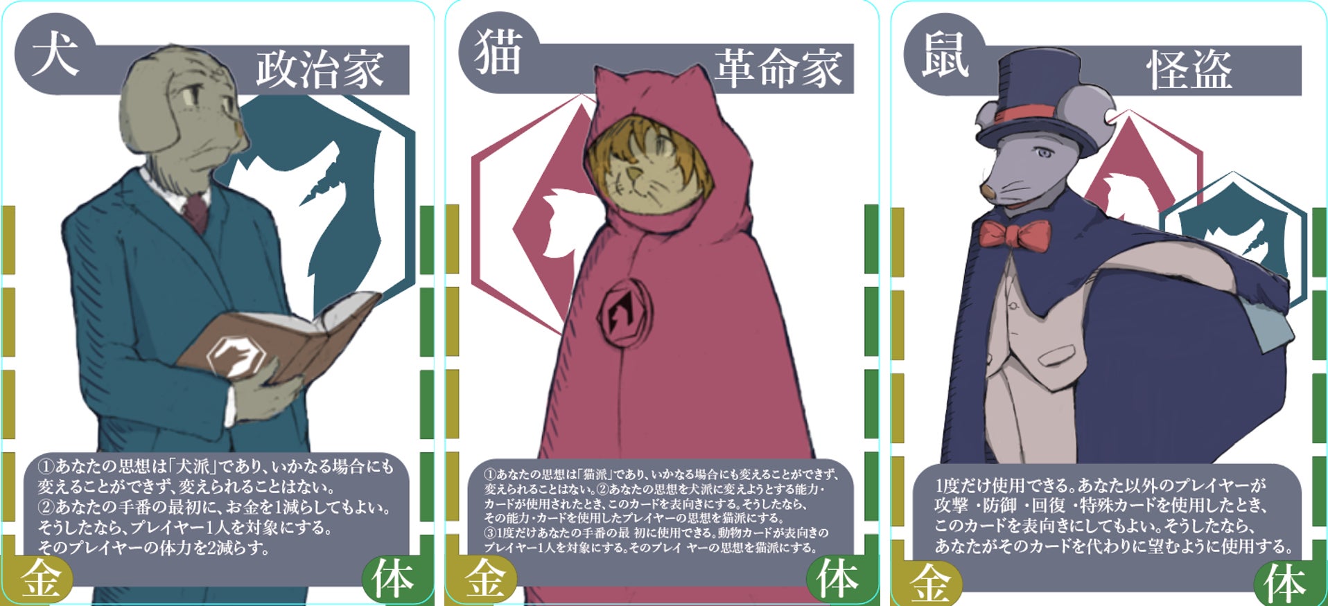 ゲーム中、「体力」か「お金」がなくなった動物は、活動自体は続けることができますが、各々の能力を使えなくなり、最後の投票に行く元気をなくしてしまいます。能力とカードを駆使して反対勢力の票数を減らし、時には自他の思想を変えて多数勢力になりましょう。