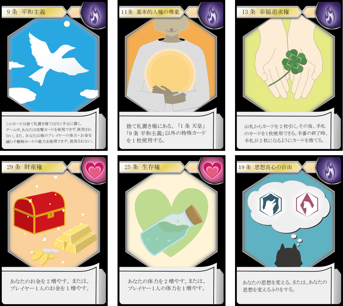 近頃、憲法改正が話題になっていますが、憲法そのものに深く触れたことのある方は少ないと思います。そこで、ボードゲームを通じて楽しく遊びながら憲法に触れてもらうというのが今作の趣旨です。