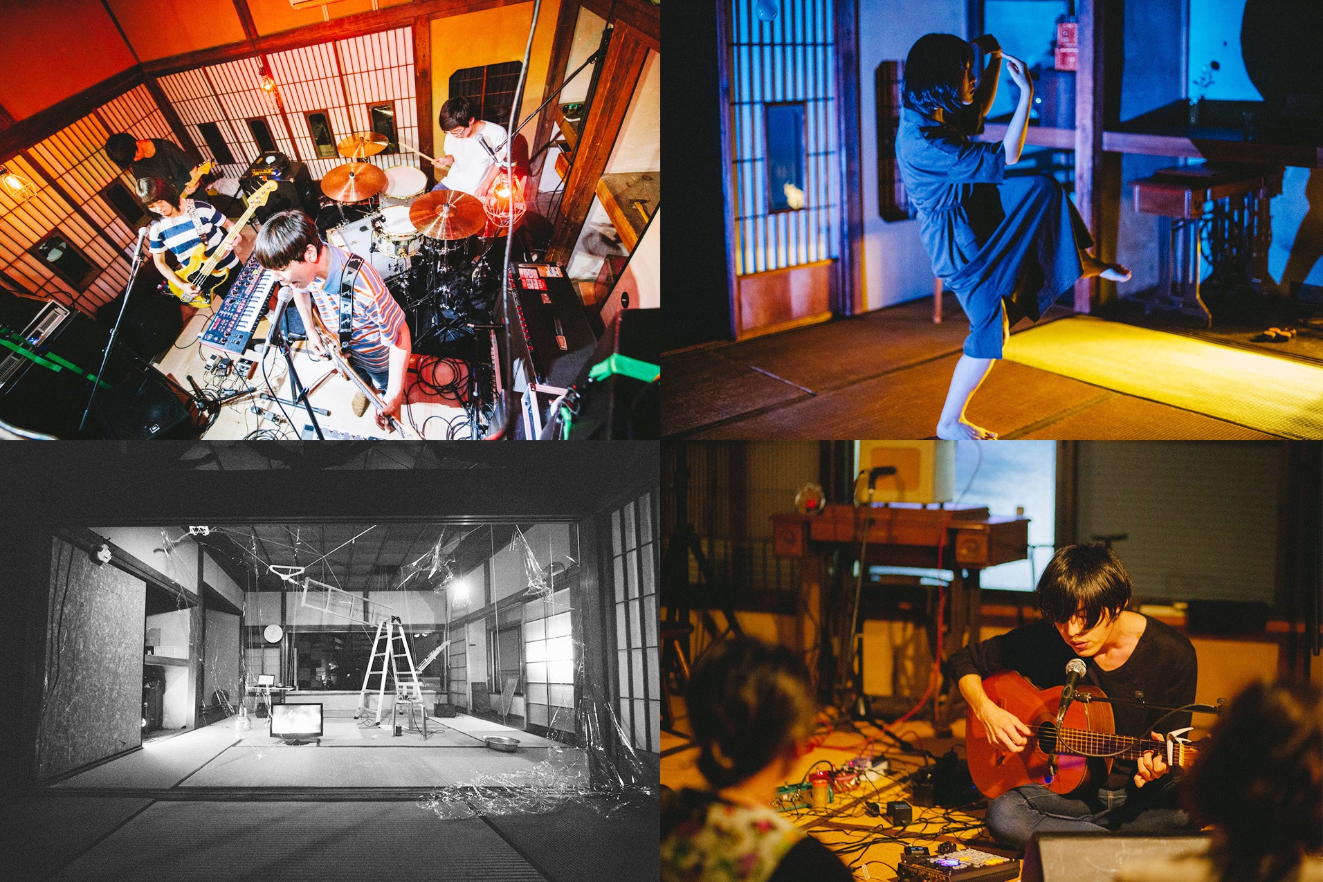 左上から Fallsheeps(バンド) / 坂藤加菜(ダンス) / 秋本ふせん(一人芝居) / 君島大空(弾き語り)弾き語りやロックバンド、ダンス、演劇。緊張感と和やかさの入り混じった独特の雰囲気を強みに、さまざまなイベントを行ってきました。演者にも観客にも、他では味わえない体験があると好評です。