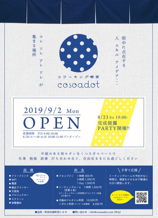 30代でカフェ、40代で赤ちょうちん的な小料理屋をやる、という学生のころからの漠然とした夢と、「我が街の働き方環境に貢献したい」という想いが、素敵な物件との出会いで急加熱し、この度「コワーキング喫茶 cosoadot(コソアドット)」というスペースをオープンすることになりました!