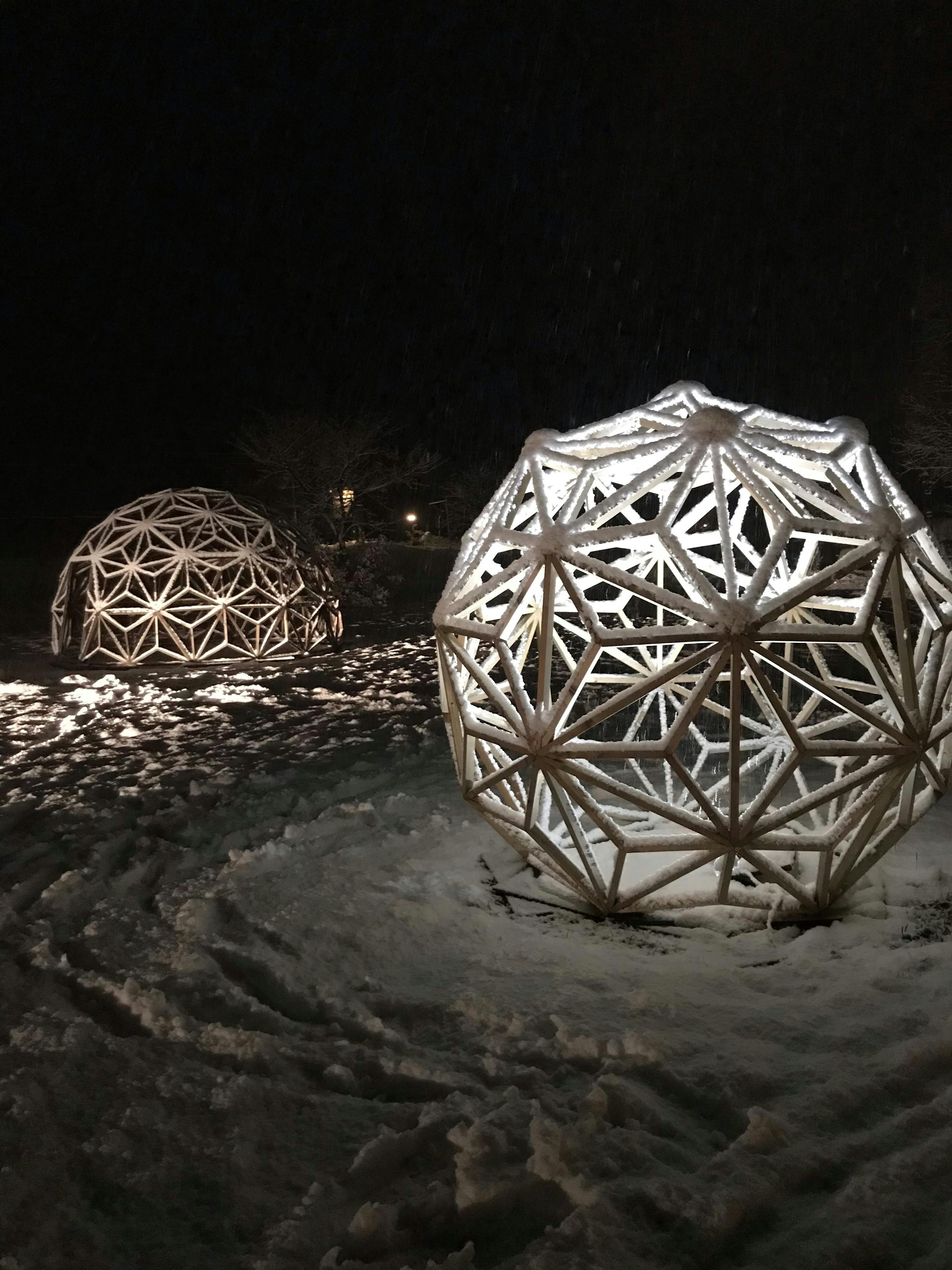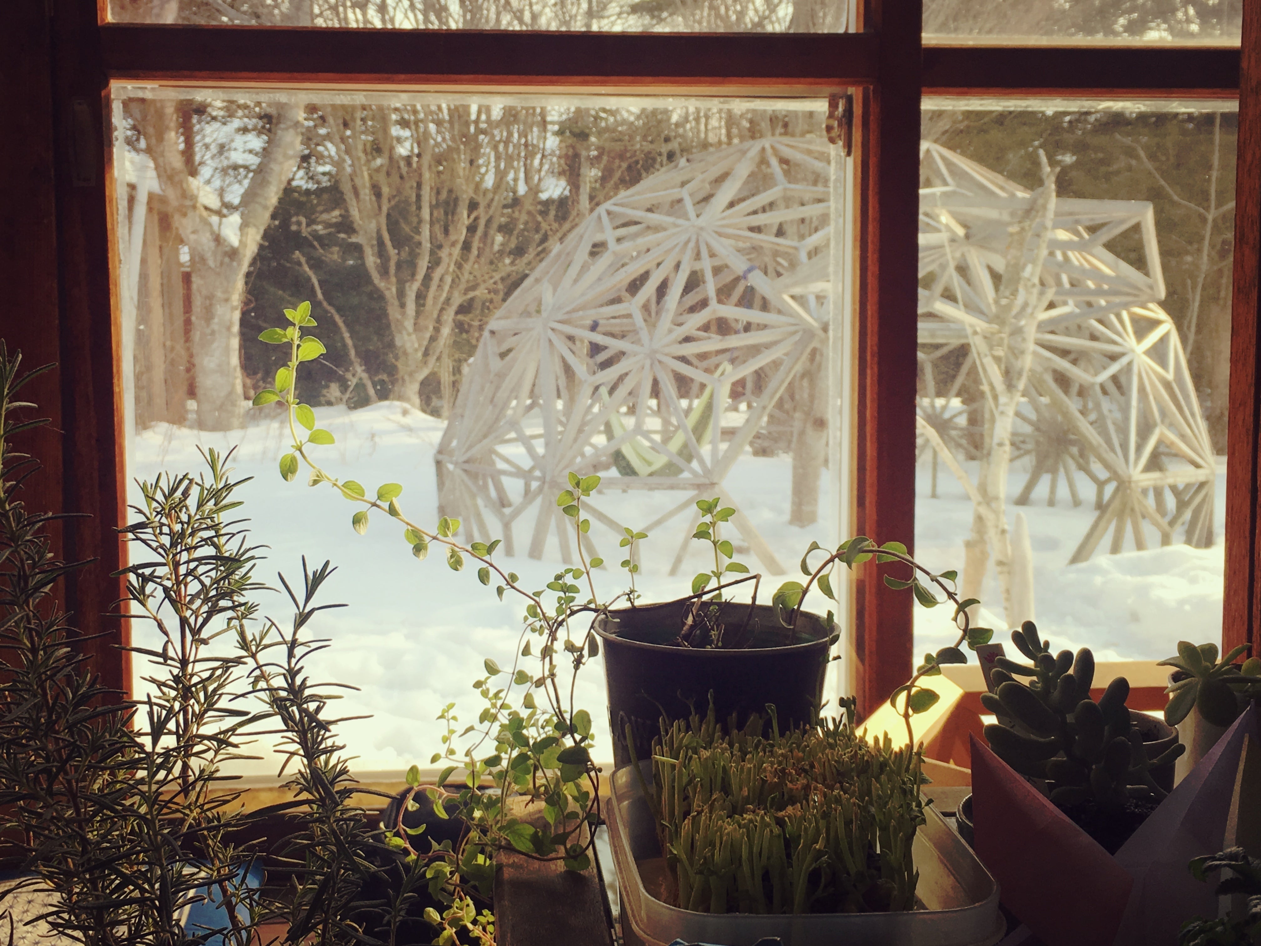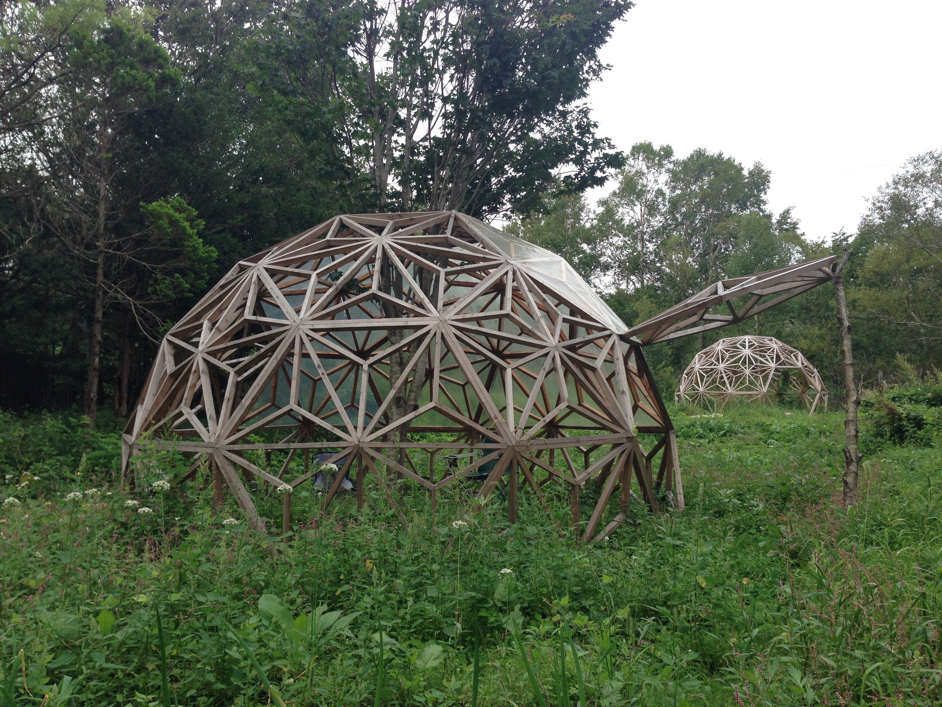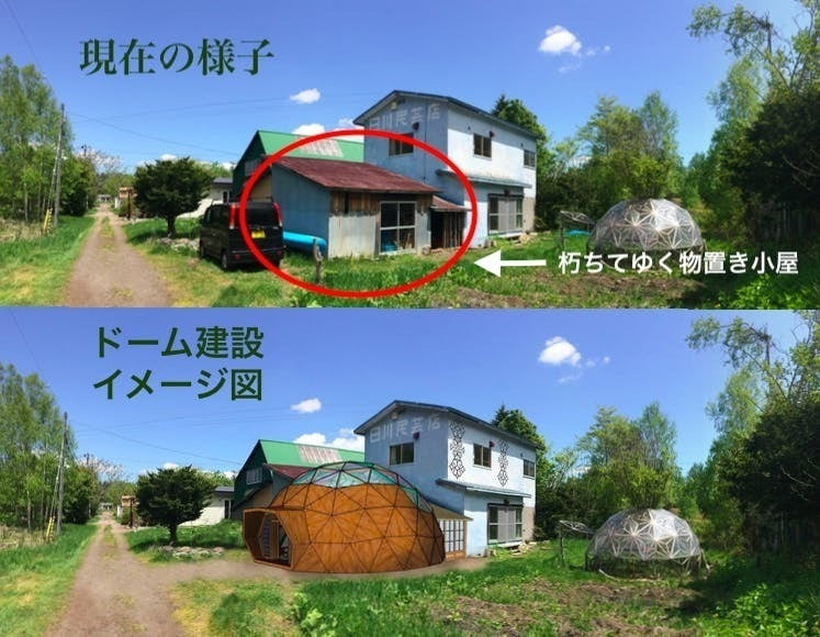 ◎家屋にくっついて朽ちゆくのを待っている物置き小屋を解体し、天窓から光が差し込む大きな幾何学模様のドームを建設します。