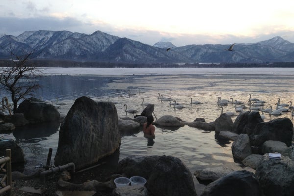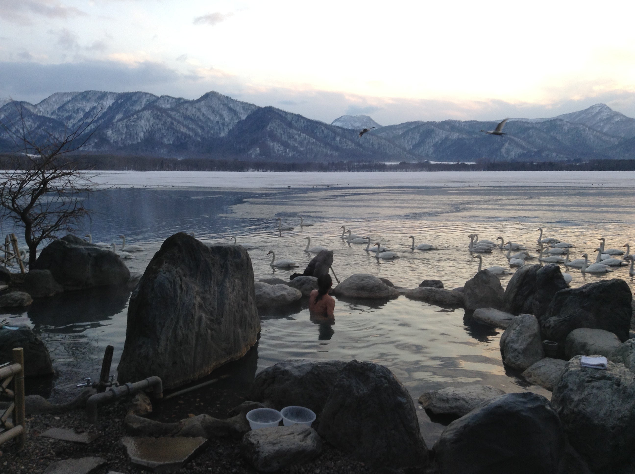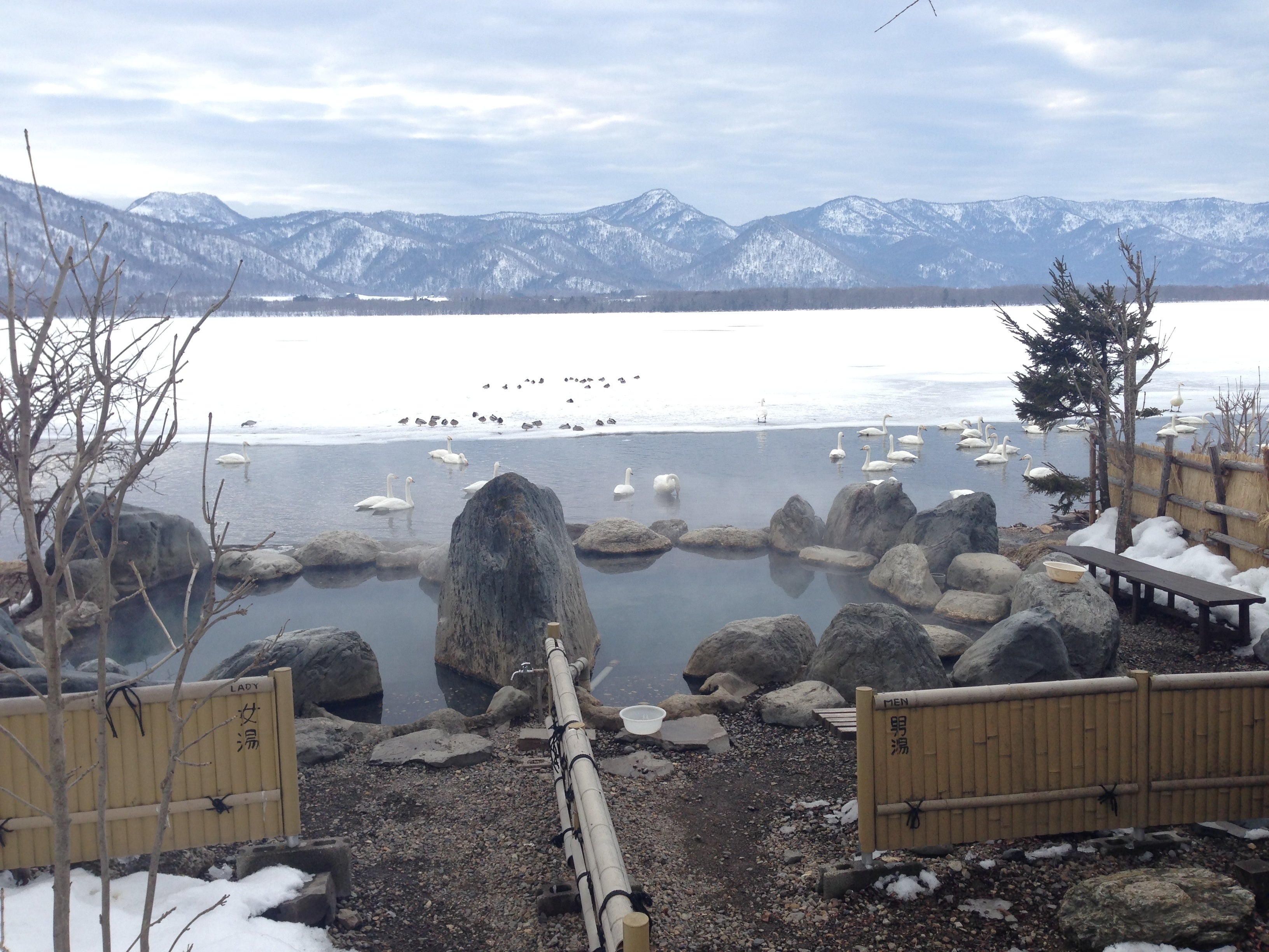 10月~4月の間はオオハクチョウが湖にやってきて、温泉に浸かりながら観察することもできます。