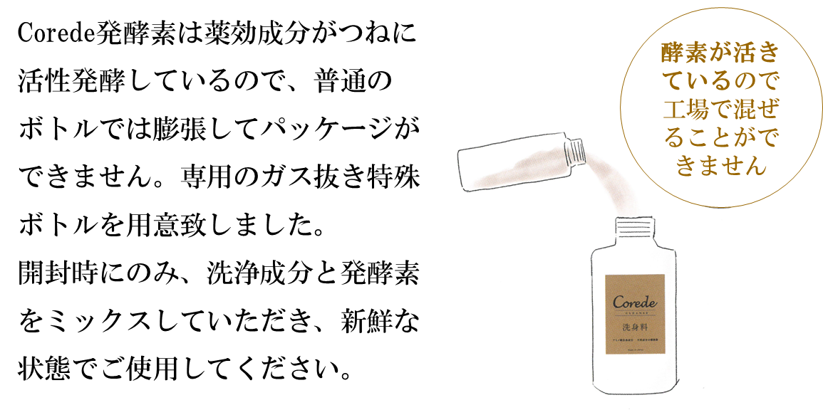 Corede発酵素シリーズの第一弾として、資金を元に洗身料を生産致します。