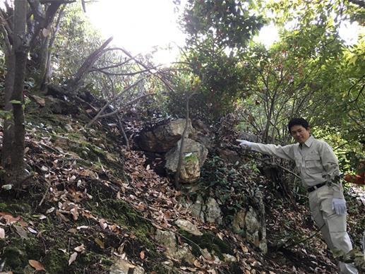※岐阜城(金華山)に埋もれている石垣を発見し写真に写る柴橋氏![]()