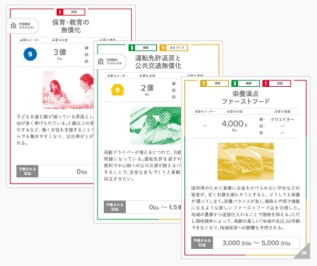 まちに良い影響をもたらすのか、期待はずれにおわるのか、はたまた、まちにネガティブな影響をもたらしてしまうのか。。。自分の行動一つ一つがまちに与える影響を考えながらプレイして頂く必要があります。