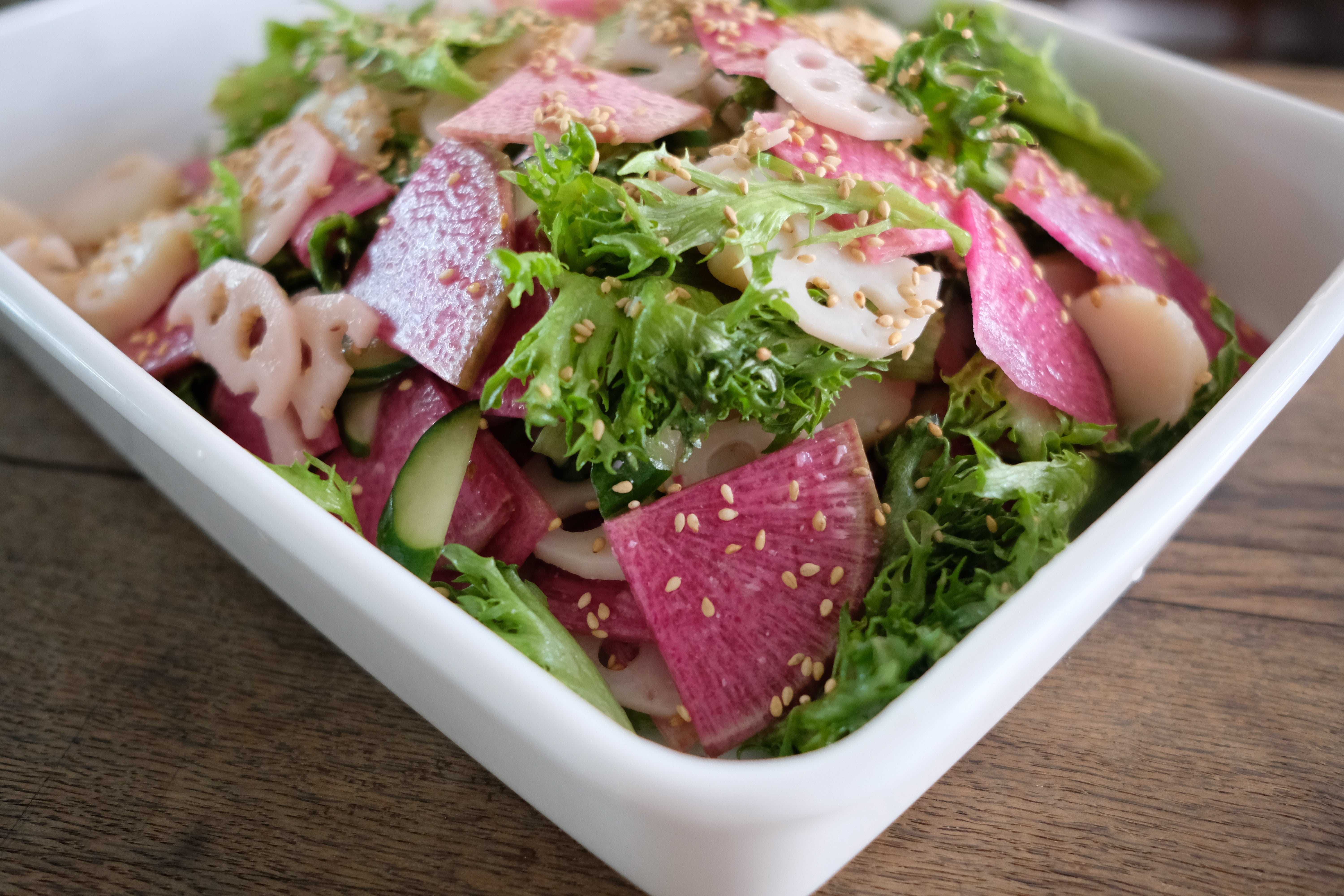 画像はほたてと紅芯大根とほたてなどを使った梅麹サラダですが
