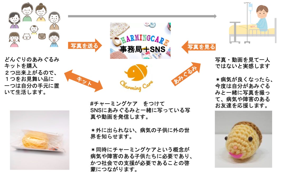 治療に前向きになれるようなグッズなどを取り扱うECショッピングモールを作り、様々なコンテンツの配信なども計画しています。病気や障害のある子どもたちやその家族だけでなく、社会で子どもの笑顔を支えていきたい。チャーミングケアという考え方を広める仲間になっていただけませんか?