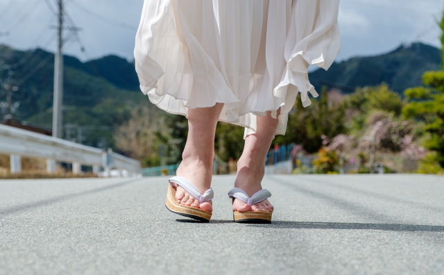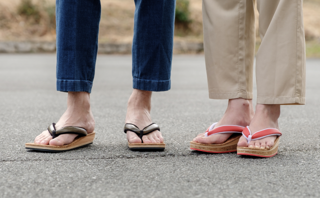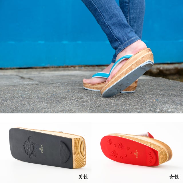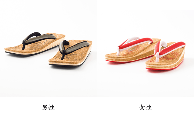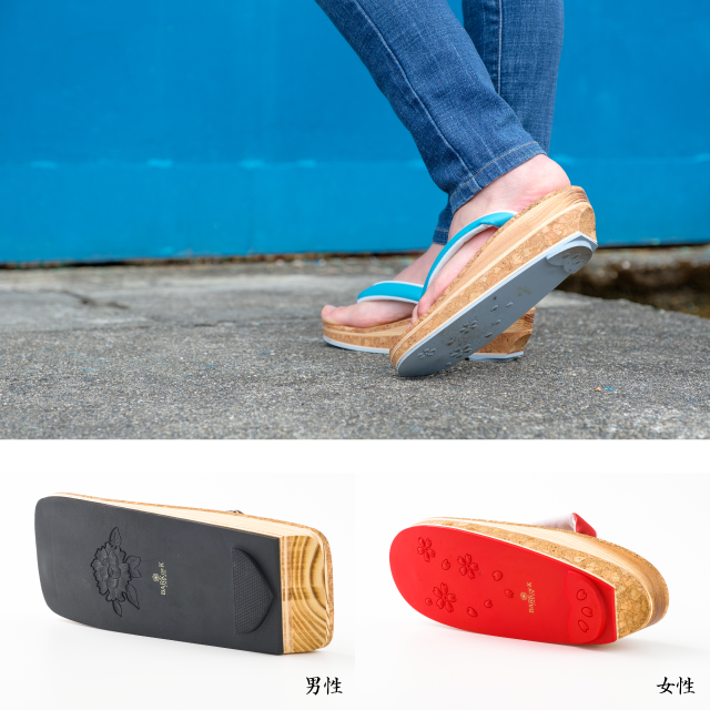 すべらないように、靴底には合成ゴムを採用しています。男性用には牡丹を、女性用には桜の花びらをかたどるなど、遊び心も取り入れています。