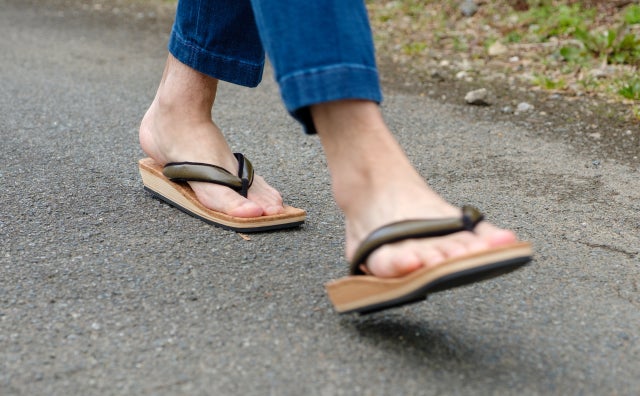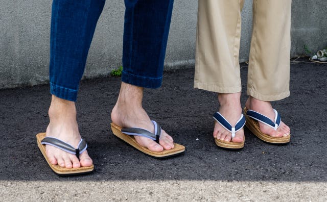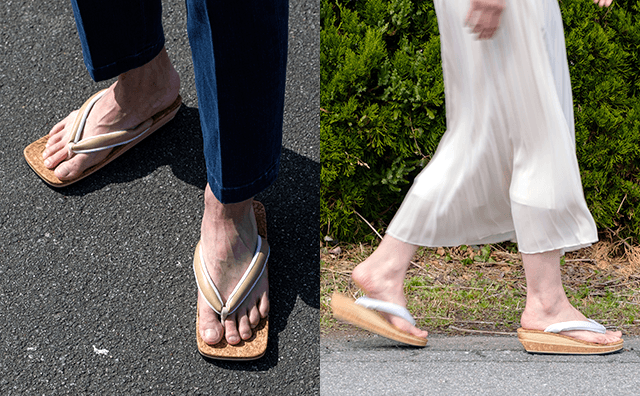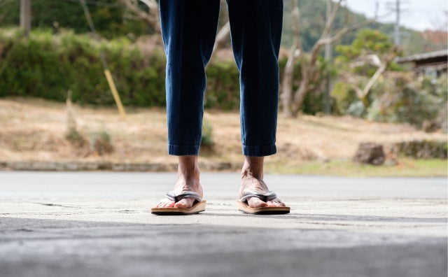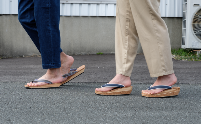 時とともに、履く人の足に合う履きものに変わってゆくのは、空気の含有率が高く、弾力性に富むコルクならでは。履けば履くほどあなたの足になじんでゆく和下駄を、愛着を持って使い続けていただければうれしいです。