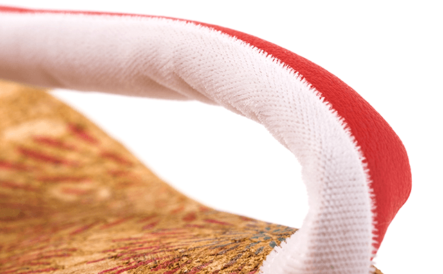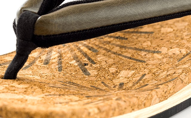 直接肌に触れる履きものに最適な、丈夫でほどよい硬度のオリジナルコルクを使用。無数にある細胞の中にミクロ単位の気泡が多く含まれているコルクは、いわば「自然のクッション」。軽量で、弾力性にも優れているので、長時間履いていても快適です。