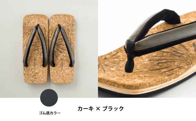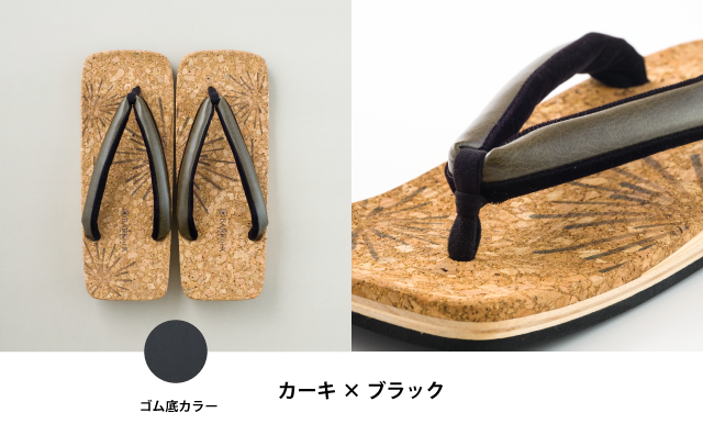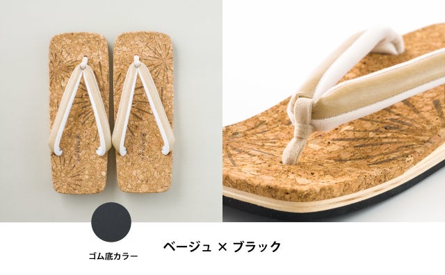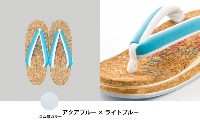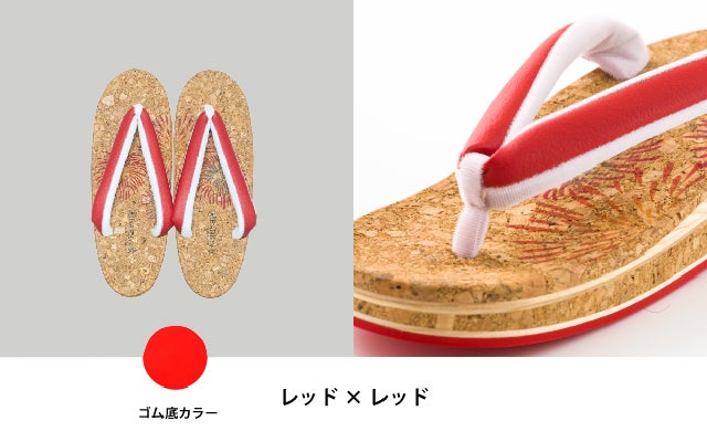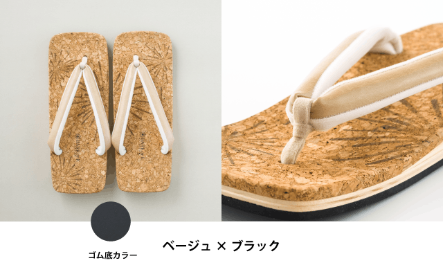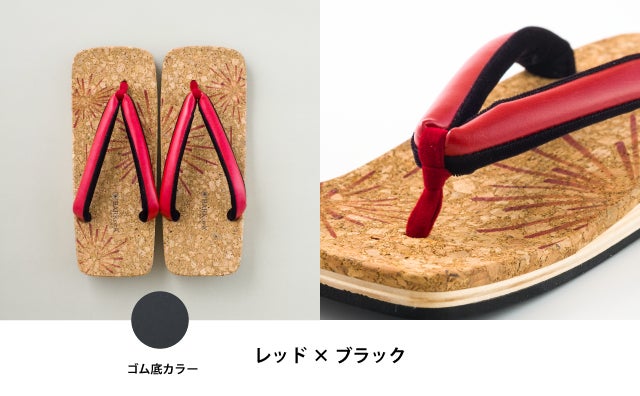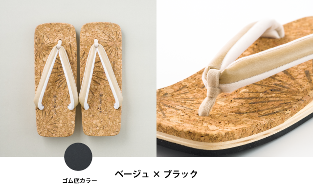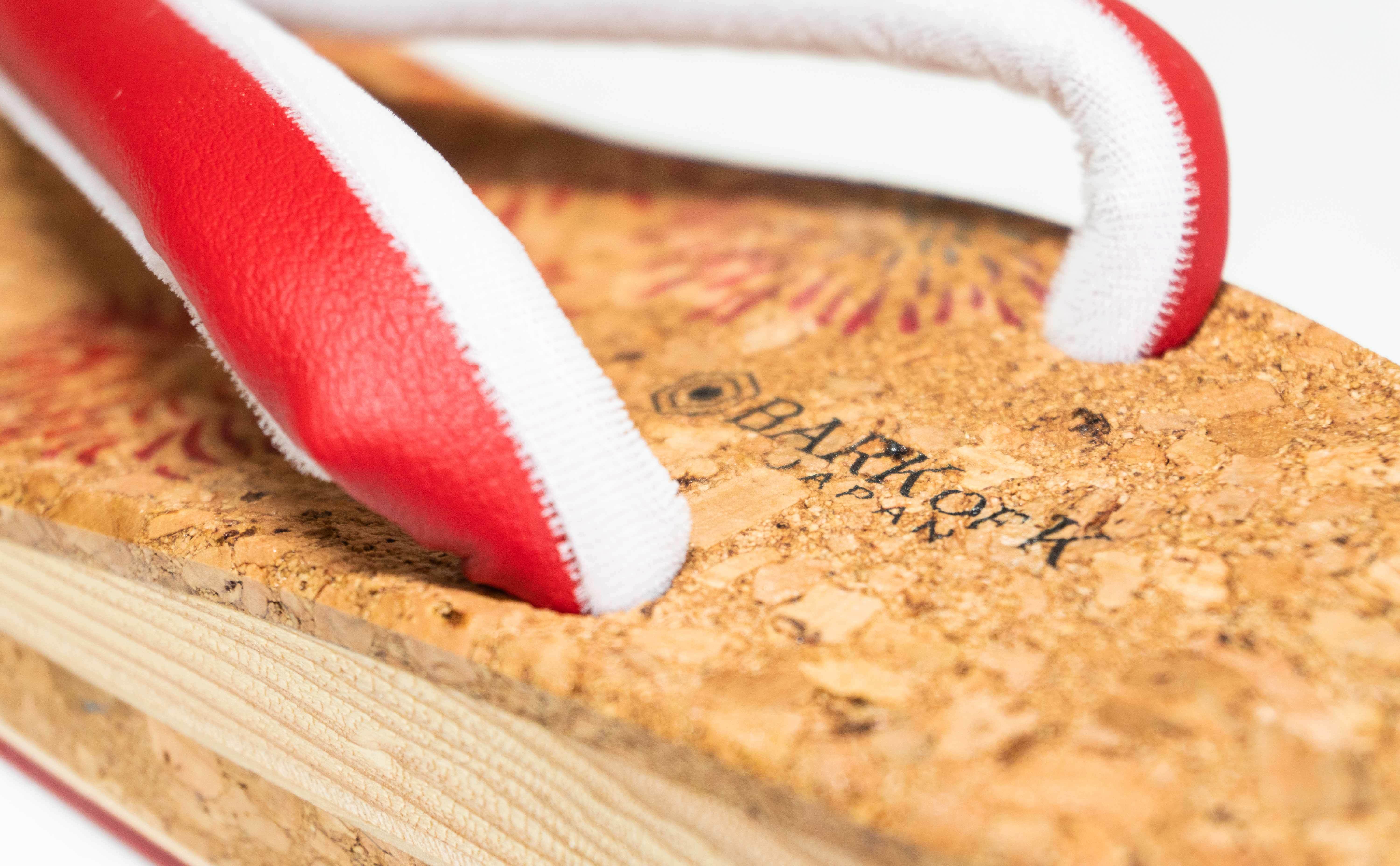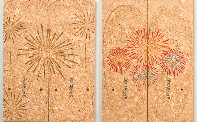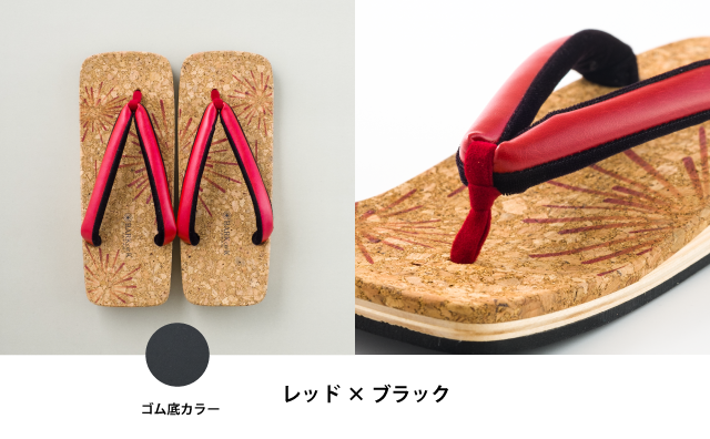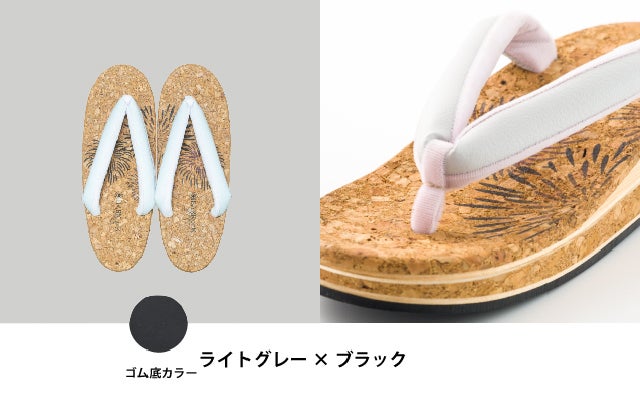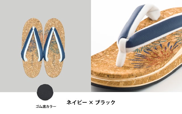 コルク面に、夏の風物詩である「花火」のプリントを施しました。左右の下駄を揃えると、夜空に舞い上がる花火が現れます。