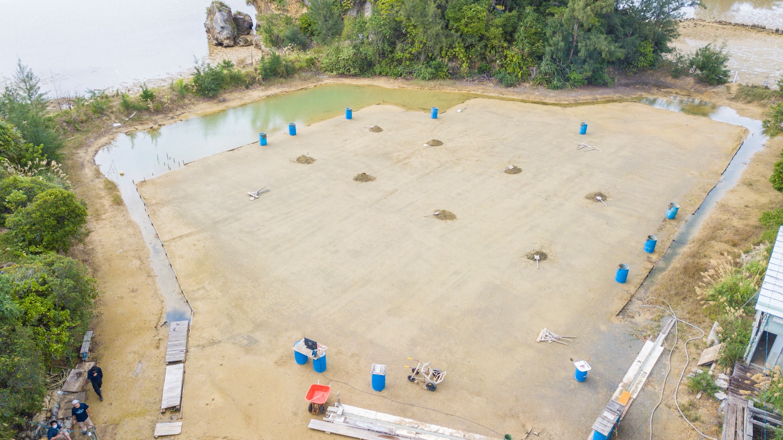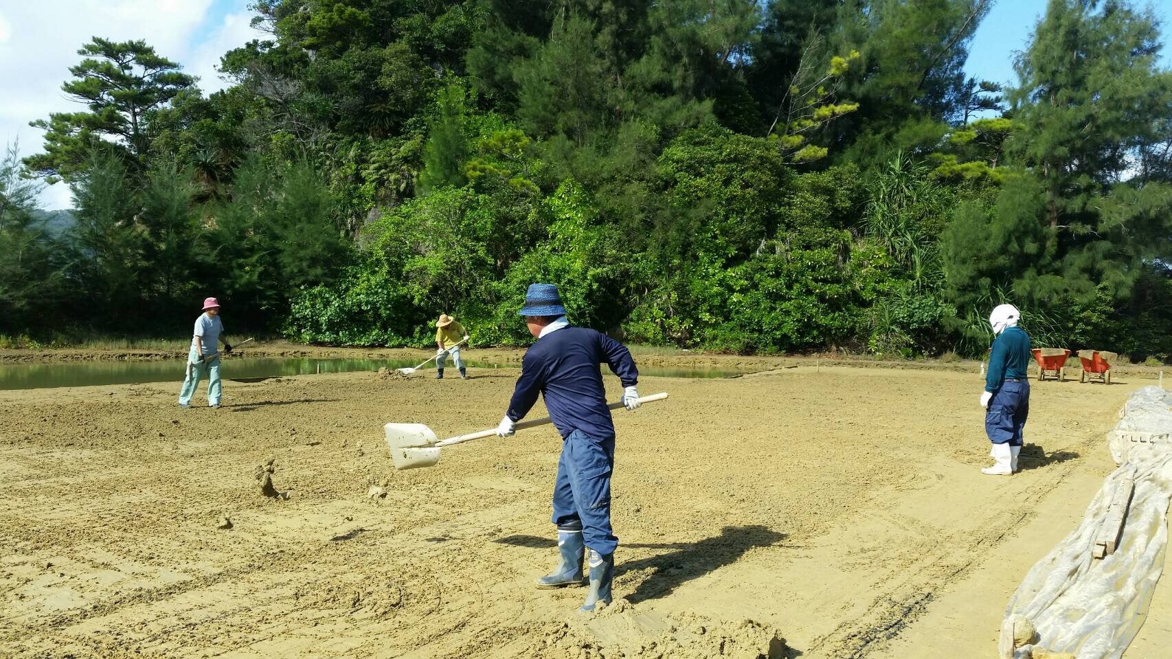 塩田の土台作りをします。 土台は海中の砂や粘土を固めたもので、地下を流れる海水から塩分やミネラルを吸い込む役割があります。