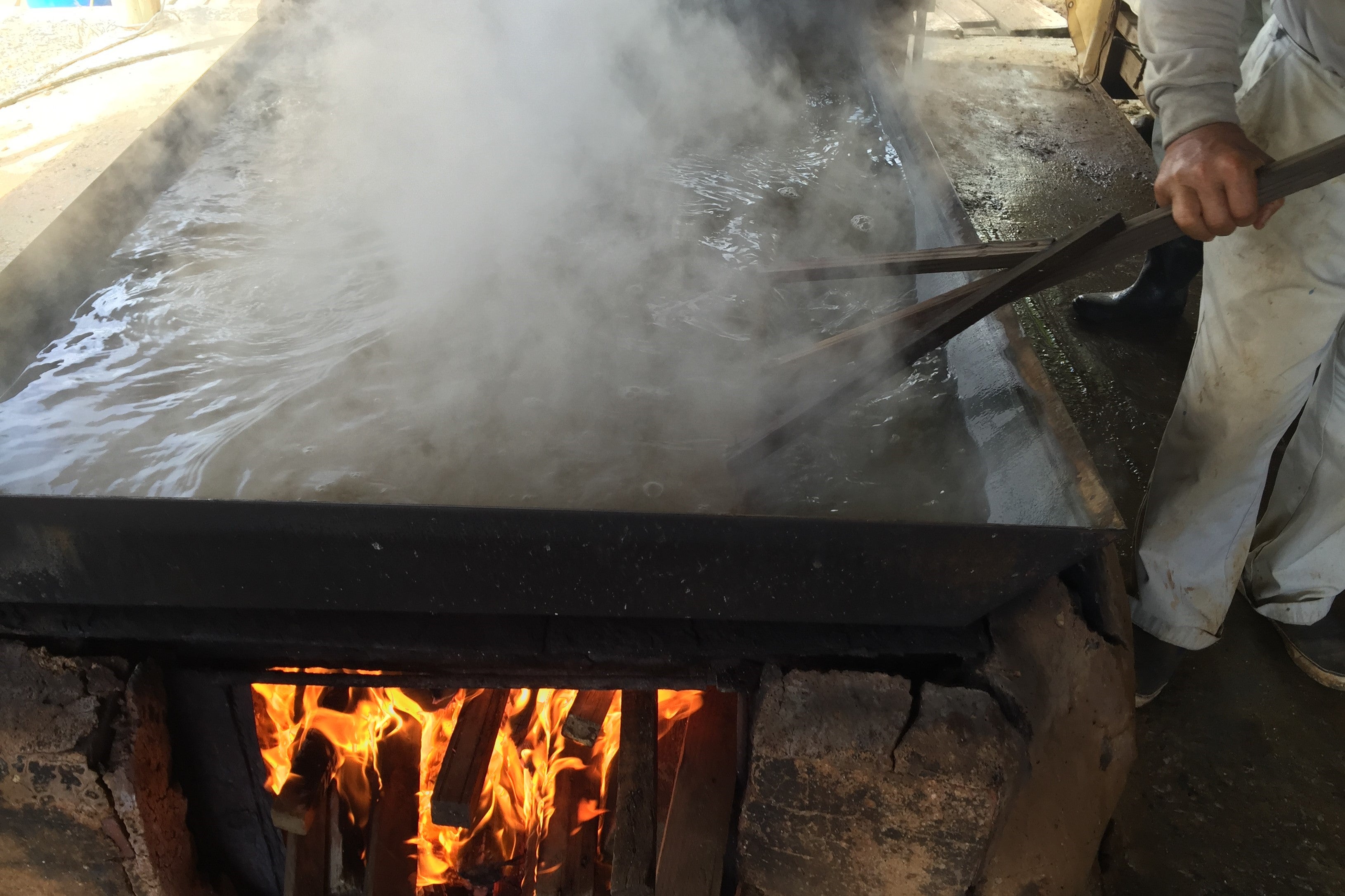 塩炊き罐を入念に洗い流し、採取した塩水(かん水)を流し込み釜に火を入れます。時々アクを取りながら煮詰めていきます。