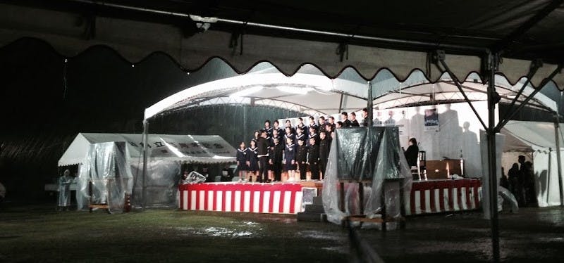 大雨の中、屋我地中学校全生徒で合唱をしました。