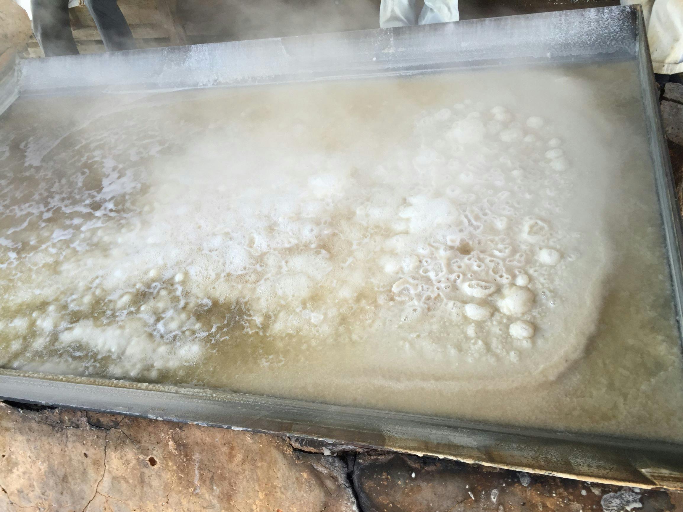 4時間ほど煮詰めると塩の花が咲き始めます。 それをすくいあげて、約3ヵ月間かけて熟成させます。(熟成工程でニガリ成分が除去されます)