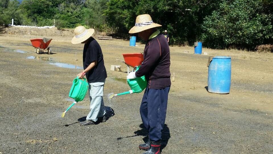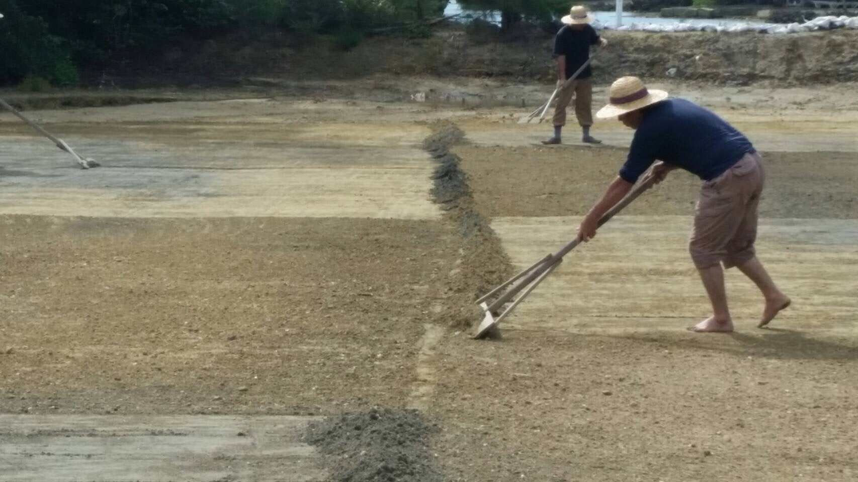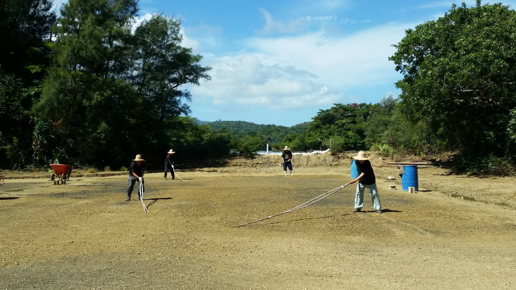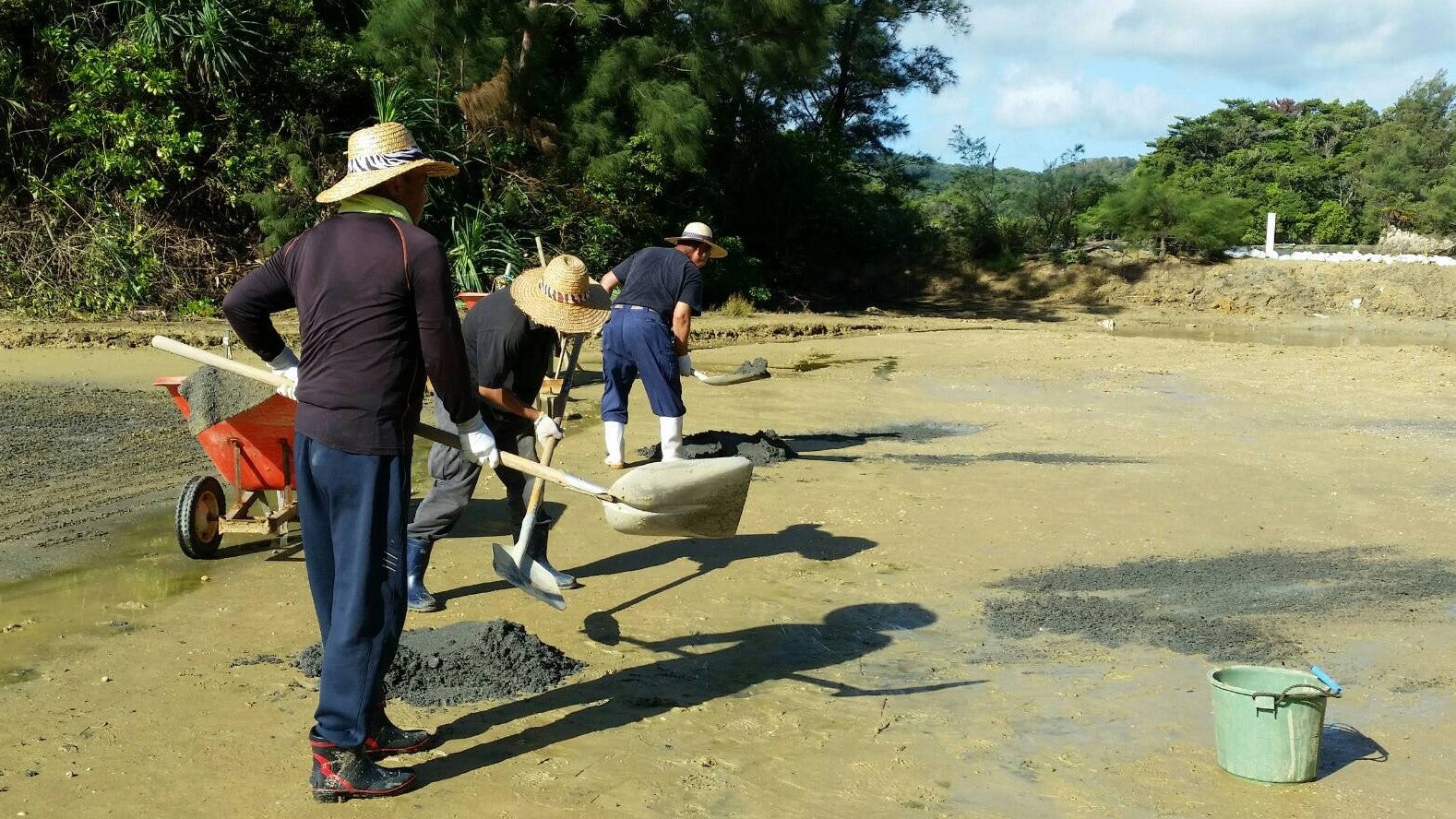塩田の土台作りをします。 土台は海中の砂や粘土を固めたもので、地下を流れる海水から塩分やミネラルを吸い込む役割があります。