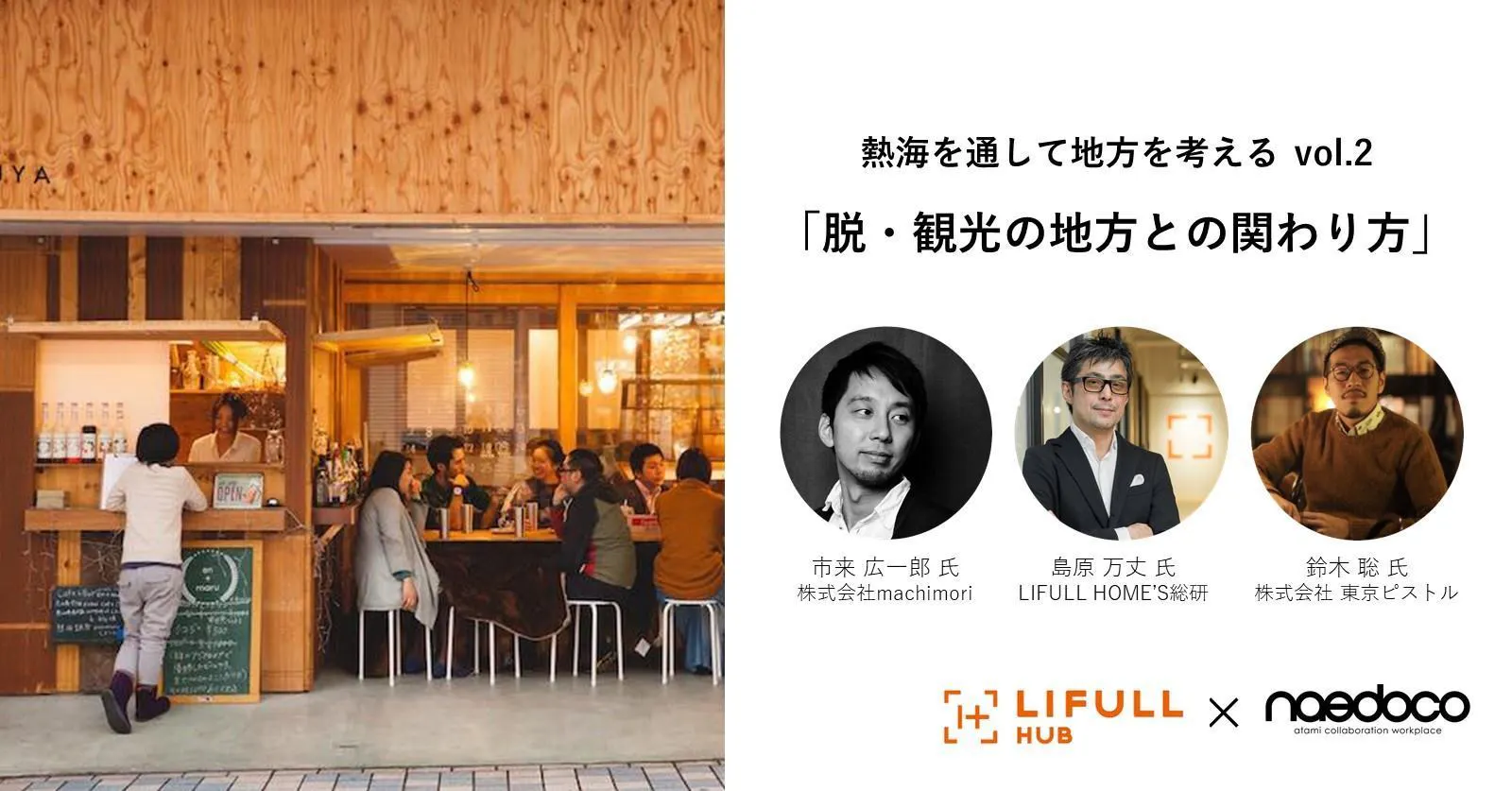 ■市来より熱海の現状などもお話しつつ、LIFULL HOME'S総研所長の島原万丈さんと東京ピストル編集長の鈴木聡さんと、一過性の観光客が集う街ではなく、クリエイティブな人たちが集まる街をどのようにつくっていくか、都会に暮らす側からの目線で、これからの地方のまちの使い方について、ディスカッションしていきます!