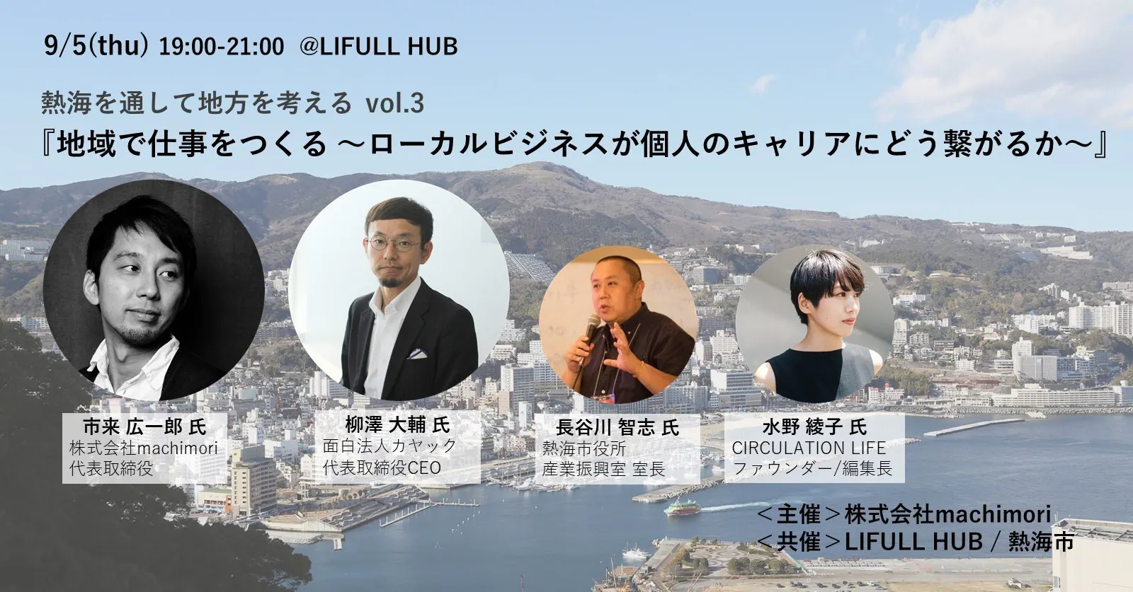 また、10月より始まる、熱海での仕事づくりのプロジェクトの募集についても、そのプログラムの概要のお話と、目指すところとどのような方に参加してほしいのか、お話していただきます。