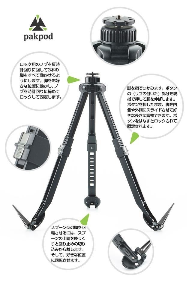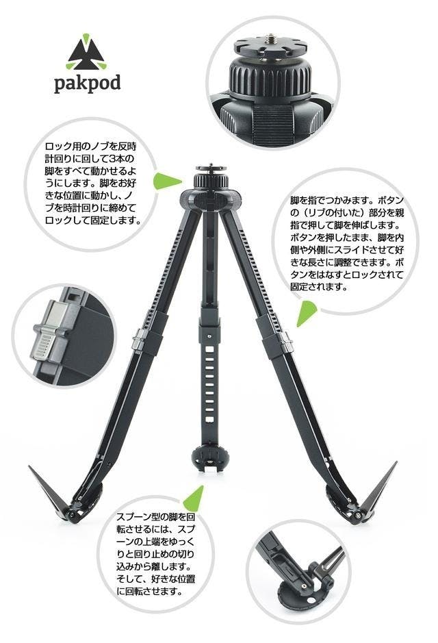 A1:スマートフォン、GoPro、デジタル一眼レフカメラ、ミニLEDライト、iPad、サウンドレコーダー、マイクなど。¼-20のネジ穴またはスタッドを持ち、記載されている定格荷重範囲内のものであれば、何でもPakpodに取り付けることができます。