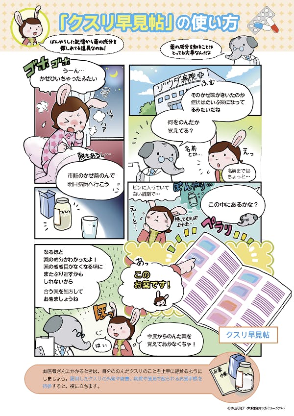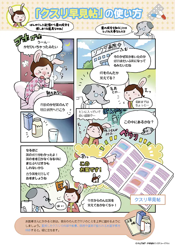 この冊子を開き、市販薬の写真をざっと見渡して、患者さんは「コレをのんできた」と指さし、その写真の左に書いてある医薬品の成分と分量を、医師や薬剤師がチェックする、というようなことを簡単・便利にできるようデザインしたのが『クスリ早見帖』です。