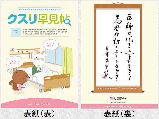 表紙(表)は、病棟のベッドサイドでクスリ早見帖を使ったコミュニケーションのイラストで、表紙(裏)は2013年10月22日に、『クスリ早見帖』のために故・日野原重明先生から頂戴した書です。