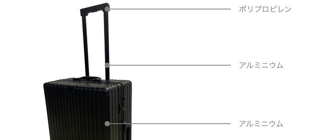 ハンドルはプラスチックの中でも高級なポリプロピレンを素材として使用しています。キャリーバーやボディは全てアルミニウムを使用しています。高級キャリーケースブランドが主に採用している素材です。アルミニウム製のBLACK INFINITYは、非常に軽量なうえに、耐久性が抜群に優れています。長期使用して傷がついても、それが貫禄となり味が出る素材です。一生物と言っても過言ではありません。もちろん錆などの心配もございません。