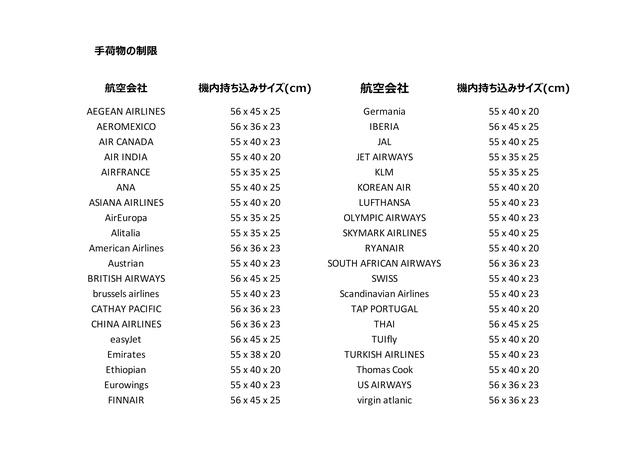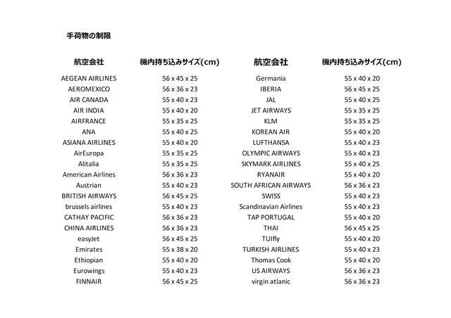 ※それぞれの航空会社は、将来、サイズ規定を変更する可能性もございますので予めご了承ください。