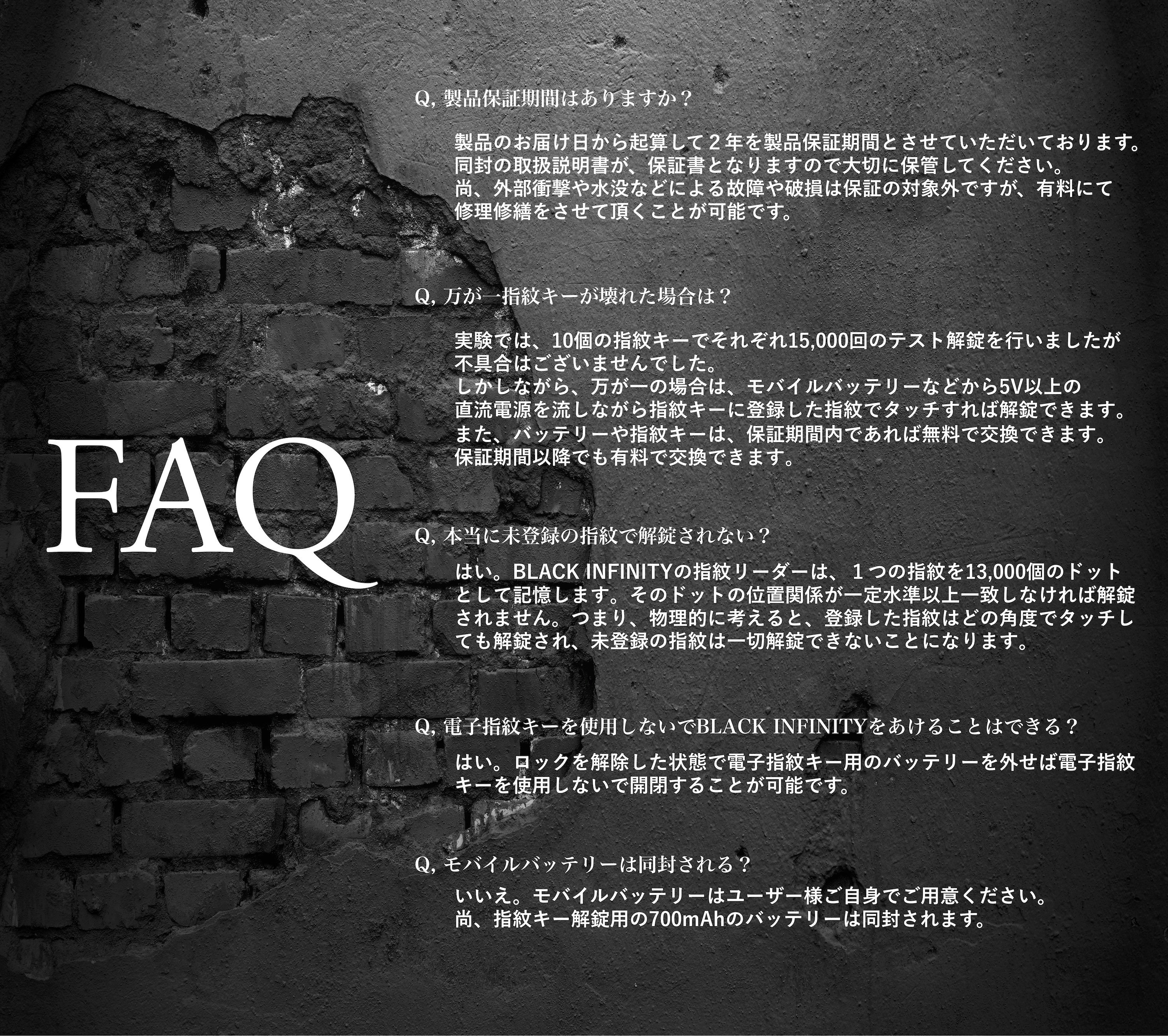 BLACK INFINITYの魅力的なファンクションの一つは、指紋キーで解錠できることです。最大110の指紋を登録することができるため、1人で10本の指の指紋を登録したとしても11名分の指紋を登録することができます。最新技術の指紋リーダーを採用しており、指紋の読み込みにかかる時間は約0.2秒です。タッチとほとんど変わりません。