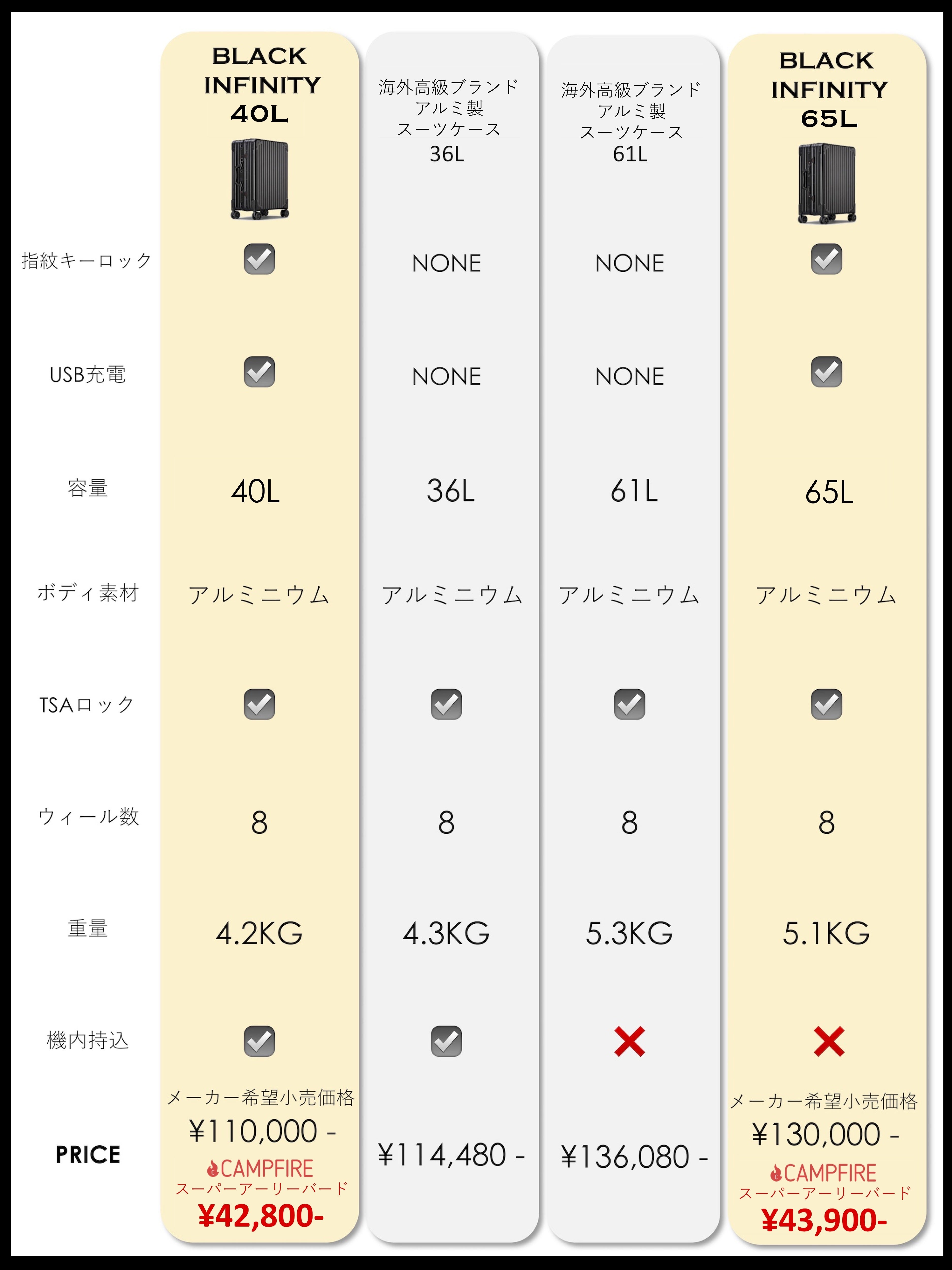 長期間の使用を目的とされたアルミニウム製のキャリーケースは、世界のあらゆるブランドが採用しております。サイズなどにもよりますが、価格相場は1,000ドル(日本円で約11万円)から、高額なものは4,000(日本円で約44万円)ドルする場合もあります。BLACK INFINITYは、アルミ製なだけではありません。指紋キーやUSBファンクションなど最先端機能を装備しました。期間限定、数量限定ではありますが、 CAMPFIREの当プロジェクトなら、圧倒的にお得な価格でBLACK INFINITYを手に入れることができます。