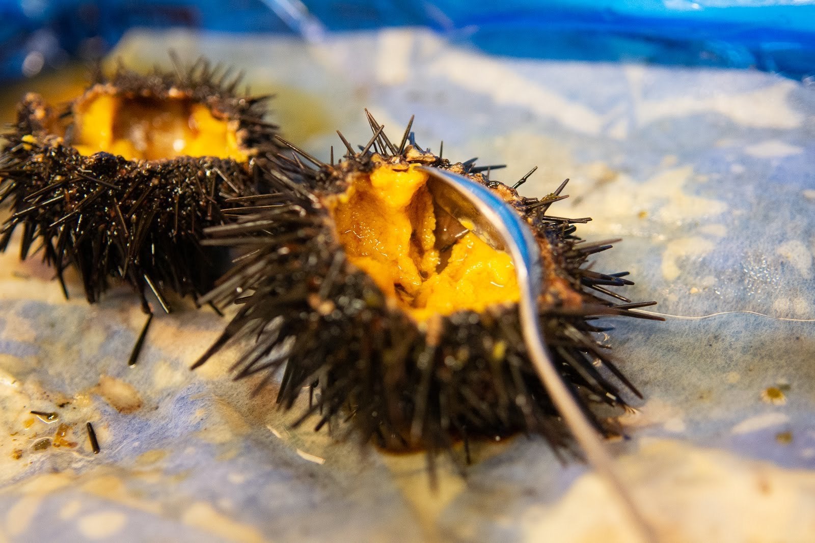 一人ひとつ、ウニを殻からさばいて食べるという企画もいれました