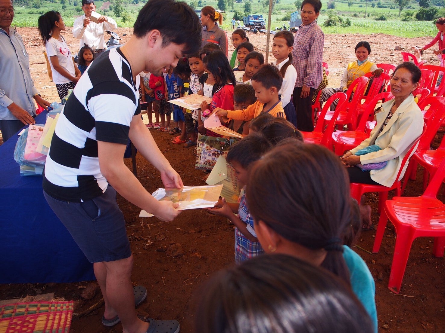 (竹中がカンボジアの学校で子供たちにプレゼントを渡している時の1枚)