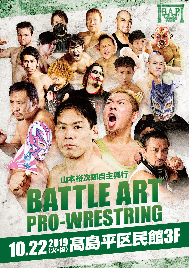 2019/08/26 21:18■【山本裕次郎自主興行battle art pro-wrestling】■10月22日(祝日・火)、高島平区民館(15:00開場、15時30分開始)■チケット料金・最前列5000円・2列目以降自由席4000円・中高生1000円(要身分証)・65歳以上無料(要身分証)・小学生以下無料(有料チケット持参の保護者同伴の場合のみ)※当日500円UP※障害者割引1000円引き(障害者手帳を持参で、ご本人と同伴者の計2名まで)チケット希望の方は、DMもしくは、yuuji.6.17.ok@gmail.comもしくは、各選手までご連絡お願いします。■全対戦カード【最終試合】山本裕次郎VSカツオ(道南リング)【第4試合】ミステル・カカオ(覆面MANIA)&CHANGO VS 守部宣孝(A-TEAM)&矢野啓太(プロフェッショナルレスリング・ワラビー)【第3試合】石川雄規VS洞口義浩【第2試合】勝村周一朗(ガンバレ☆プロレス)& 唐澤志陽(M16TOKYO)&瓦井寿也&川島真織VS ザ・ブルーシャーク& たけむら光一(打撃武道我円)& 中川達彦(打撃武道我円)& ジョシュ・オブライエン【第1試合】原学&櫻井匠(A-TEAM)VS清水来人&スーパーマッチョモンキー もっと見る
