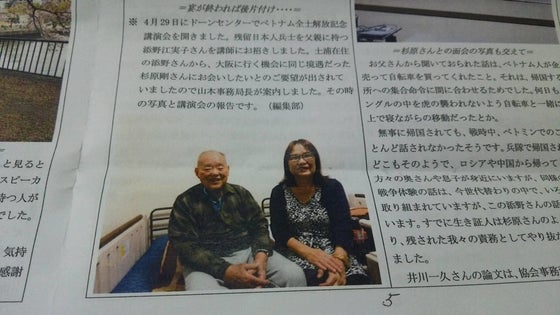 2017/06/08 08:424月29日にドーンセンターで開催された日本ベトナム友好協会大阪府連合会の講演会に講師として招かれ、その際に父と戦友だった杉原さんにお会いしました。杉原さんは最後の生き証人かと思われます。お元気な様子で良かったです。 もっと見る