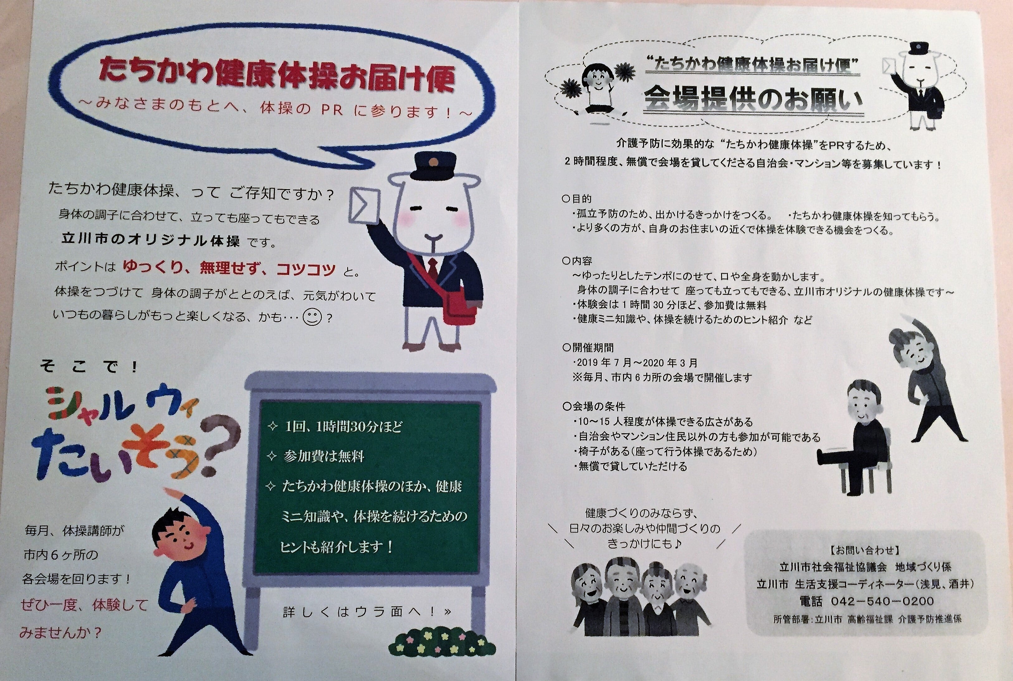 2019/08/30 17:25タイミング早すぎというか、遅すぎというか、、、立川市の高齢者施策の一環「たちかわ健康体操」の会場打診が、昨日ありました。無償貸与ということですが、引き受けるつもりです。活動報告という感じでもないのですが、一応お知らせいたします。当店舗には、やはり手すりが必要です。 もっと見る