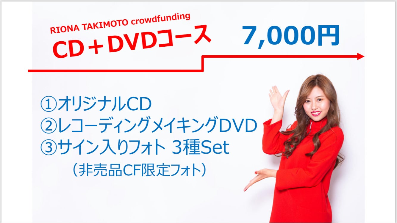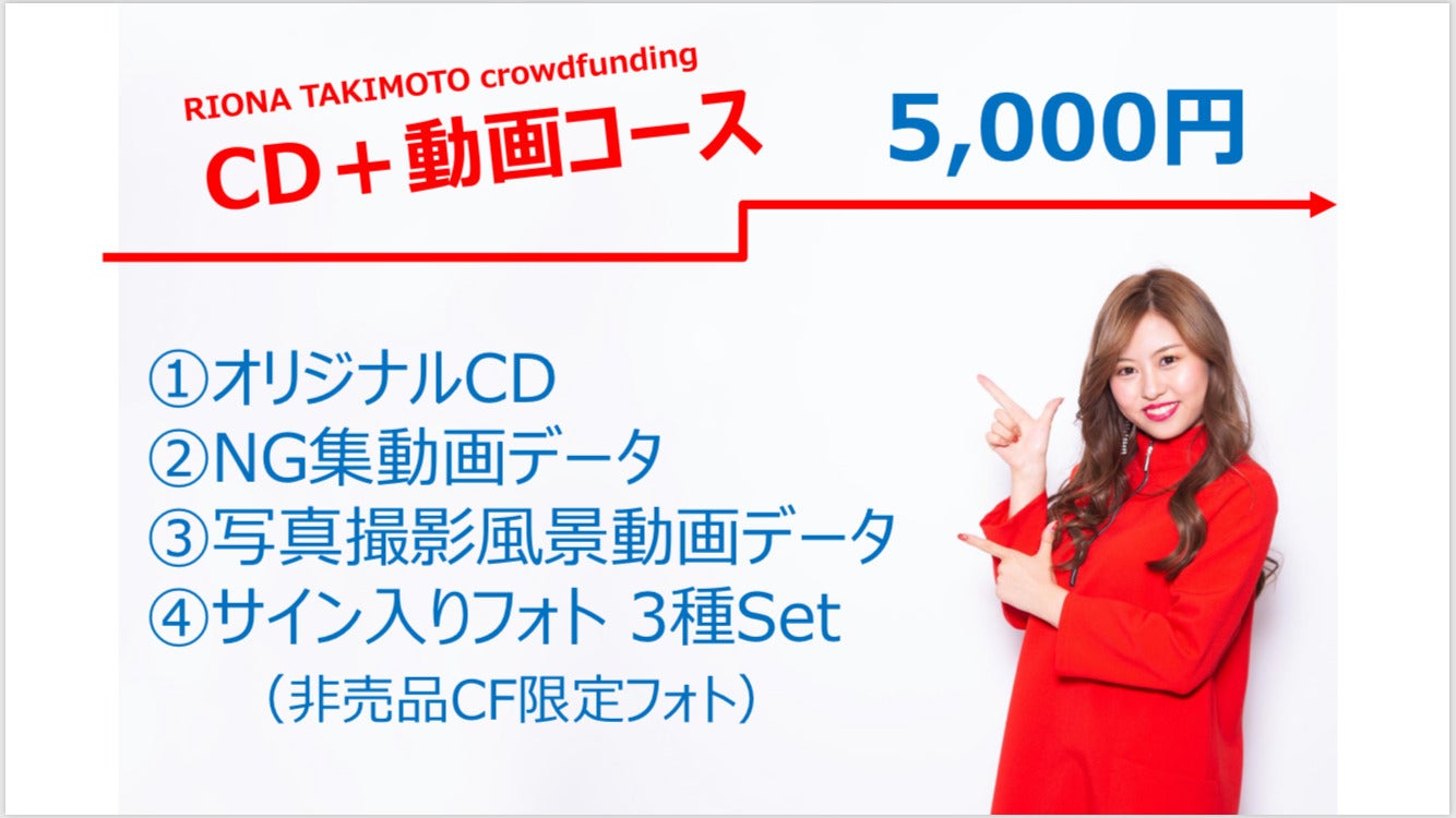 A:CD+動画コースのショート動画2種を指します。1つ目はこのトップでも紹介されているクラウドファンディングの宣伝動画を撮影編集する中で絶対見せられないNG集です。素の瀧本りおなが炸裂して笑えます。2つ目は先日アーティスト写真を撮影した時の模様を撮影編集した動画です。クラウドファンディングのリターンでもある写真たちがどのように撮影されたかご覧いただけます。