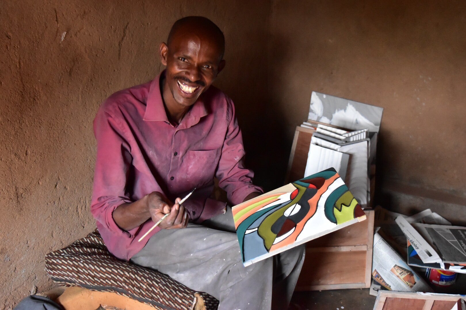 こんにちは。読んでくださりありがとうございます。加藤雅子です。今回のイミゴンゴ展 - imigongo tokyo - では3つの工房さんにイミゴンゴの作成を依頼しています。そのうちの1つKOIIKI(コイイキ)工房さんのご紹介です。イミゴンゴの発祥地キレへ郡に拠点を置き、日夜イミゴンゴ作りを進めています。KOIIKI 工房メンバーと実習中の学生さん 子連れ出勤当たり前現在12名のメンバーが所属し、そのほかに8名の学生さんが作り方を学びに来ています。トレーニング期間を終えて希望があれば、この工房のメンバーになることもできます。主要メンバーのAlexisイミゴンゴ作成中のAlexis彼はもともと電気技師として働いていましたが、伝統工芸への興味が日ごとに増してイミゴンゴ職人へ転身。奥さんは伝統工芸の道に進むことをとても喜んでくれたそうです。もっとも古くから活動しているイミゴンゴ作りの団体の一人に、直々に作り方を習い現在イミゴンゴの作り手さんとして12年ほど活動しています。首都キガリやルワンダ西部でもイミゴンゴ作りのクラスを担当するなどルワンダのあちこちを巡って教えています。ルワンダの伝統工芸と言っても、ルワンダ人でイミゴンゴを知らない人も多々います。イミゴンゴの話をしても「何それ?」イミゴンゴの写真を見せて「これだよ〜」と言うと「うーん、なんか見たことあるけど、、、何に使うの?」「あー、装飾 (imitako: イミタコ)のこと?」「初めて見たわー」という反応も珍しくないです。Alexisはルワンダ人にももっとイミゴンゴを知ってもらいたいとその活動範囲を日に日に広げています。今は3人の小さな娘さんたちが、トコトコとパパの仕事場によく出入りをしています。どんな風に仕事をしているのか、間近で見られる経験は素敵だなぁと思いながら眺めています。今回の展示用イミゴンゴの一部、リターン用イミゴンゴの一部を彼に作ってもらっています。楽しみにお待ちいただけると嬉しいです。加藤雅子